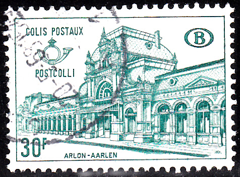 Hier zeige ich eine Postpaketmarke zu 30 Francs (MiNr 61) mit einer Abbildung des Bahnhofes in Arlon.