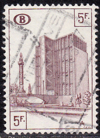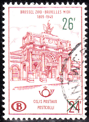 Auf dieser 1962 erschienenen Marke zu 24 Francs (MiNr 54) wird eine Abbildung des Alten Bahnhofs Brüssel-Süd (1869 - 1949) gezeigt. Sie wurde 1963 mit einem grünem Bdr.-Aufdruck des neuen Wertes (26 Francs) versehen und wird mit diesem Aufdruck unter der MiNr 55 geführt.