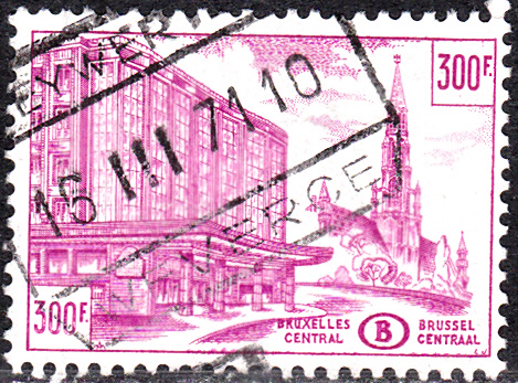 Auf dieser 1963 erschienenen Marke zu 26 Francs (MiNr 56) wird eine Abbildung des Zentralbahnhofes in Antwerpen gezeigt. Sie wurde 1964 mit einem karminfarbenem Bdr.-Aufdruck des neuen Wertes (28 Francs) versehen und wird mit diesem Aufdruck unter der MiNr 57 geführt.