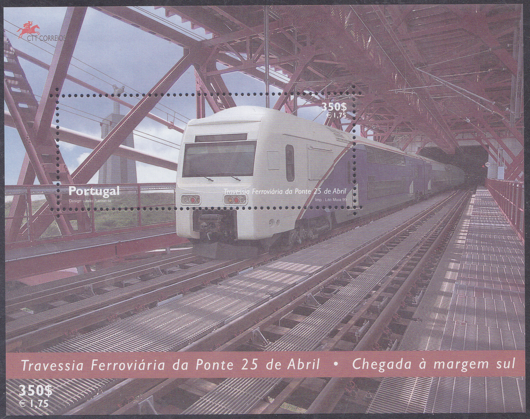 Zur Eröffnung der Eisenbahntrasse über die Tejo-Brücke in Lissabon erschien in Portugal eine Markenausgabe. Hier die Marke zu 51 Escudo / 0,25 € (MiNr 2358) mit einem Zug beim Überqueren die Tejo-Brücke.