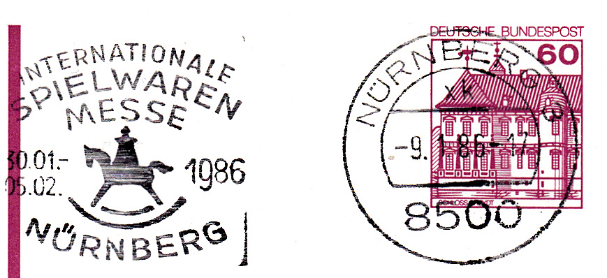 Maschinenwerbestempel vom 9.1.1986 aus Nürnberg 3 mit dem Werbeeinsatz zur Spielwarenmesse. Im Bild sehen wir das Logo der Messe, ein Turm auf einem Schaukelpferd.