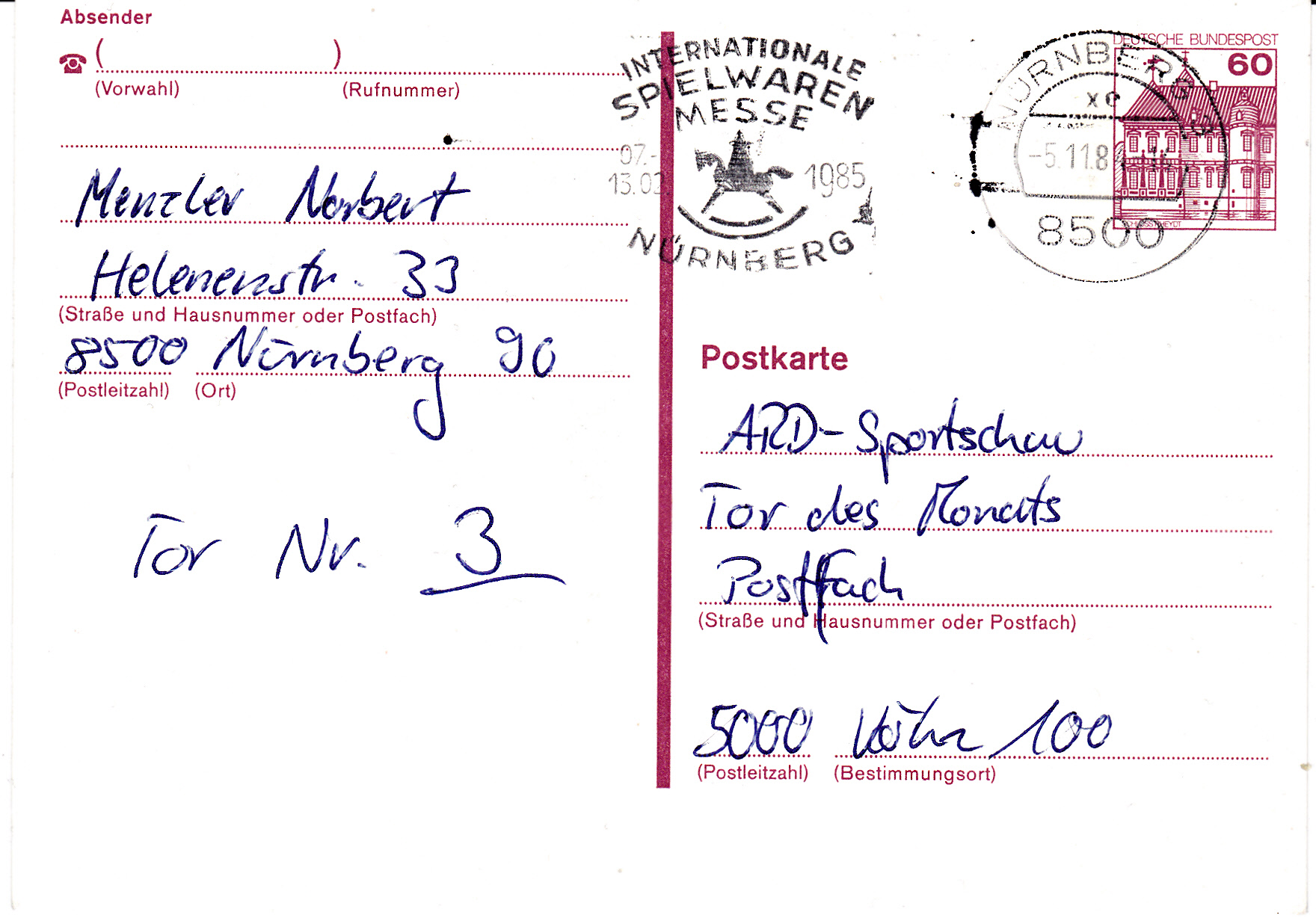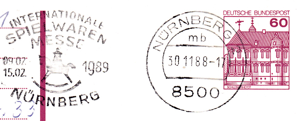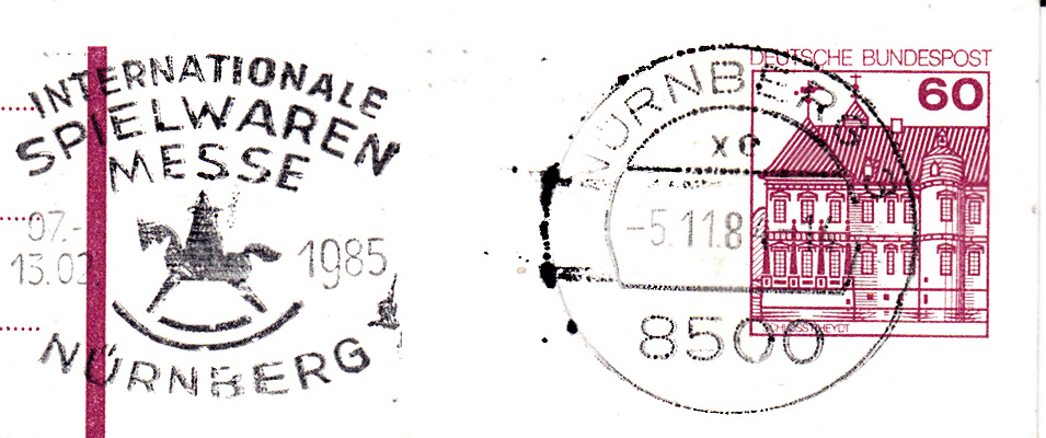 Hier noch ein Maschinenwerbestempel vom 5.11.1984 mit bildgleichem Werbeeinsatz zur Spielwarenmesse 1985.