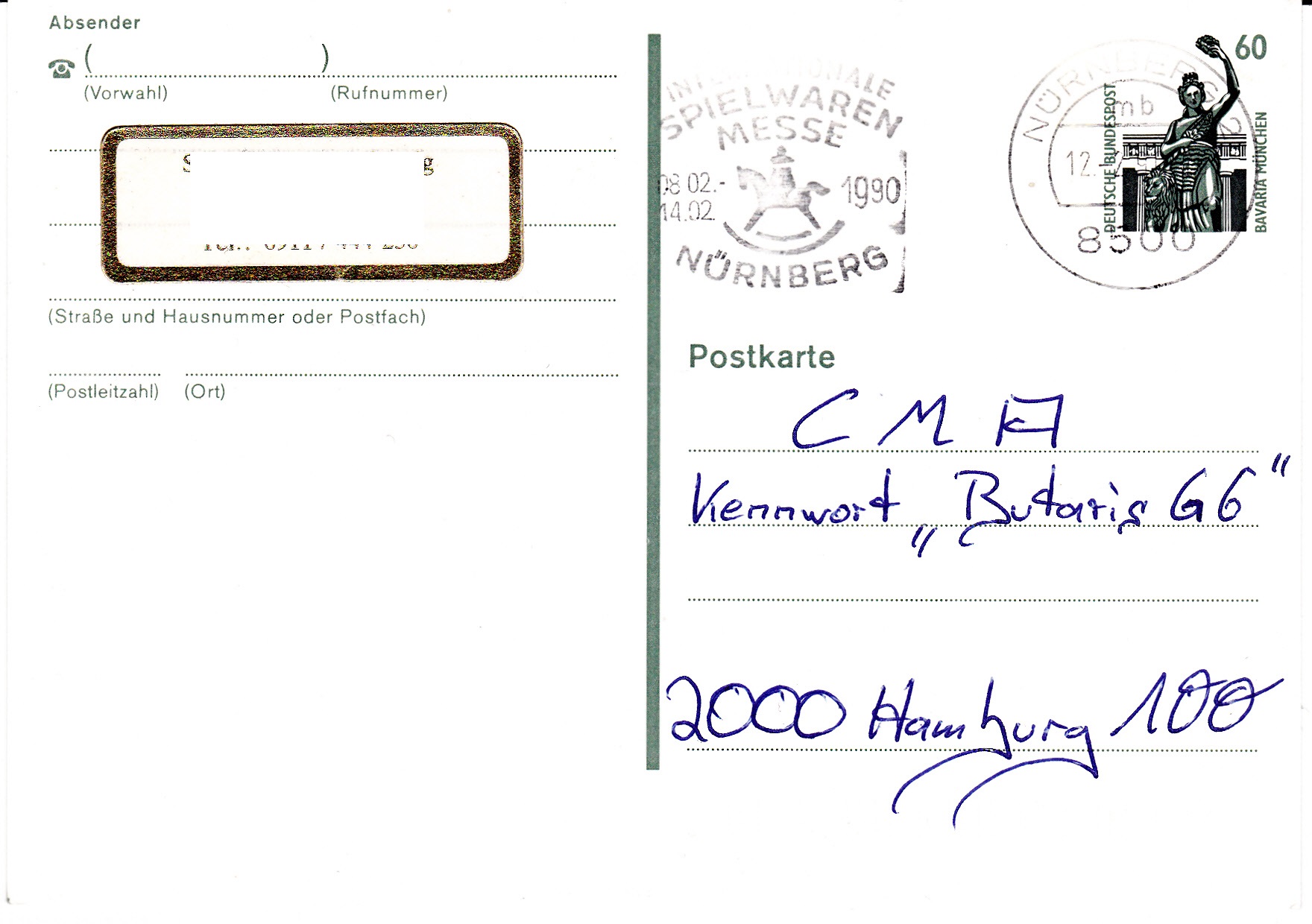 Ein weiterer Maschinenwerbestempel mit bildgleichem Werbeeinsatz, jetzt zur Spielwarenmesse 1990 aus Nürnberg 2 vom 12.2.1990.