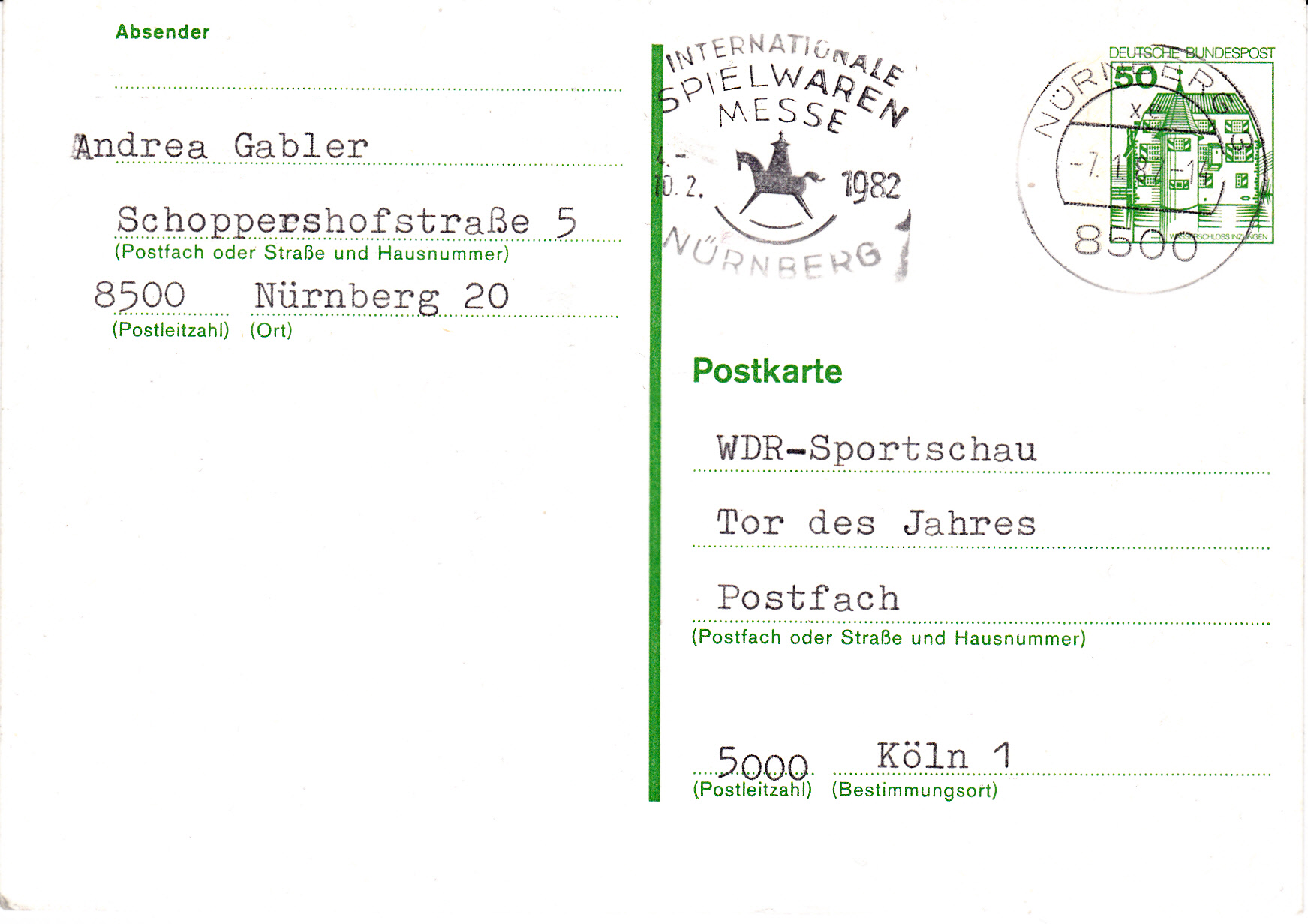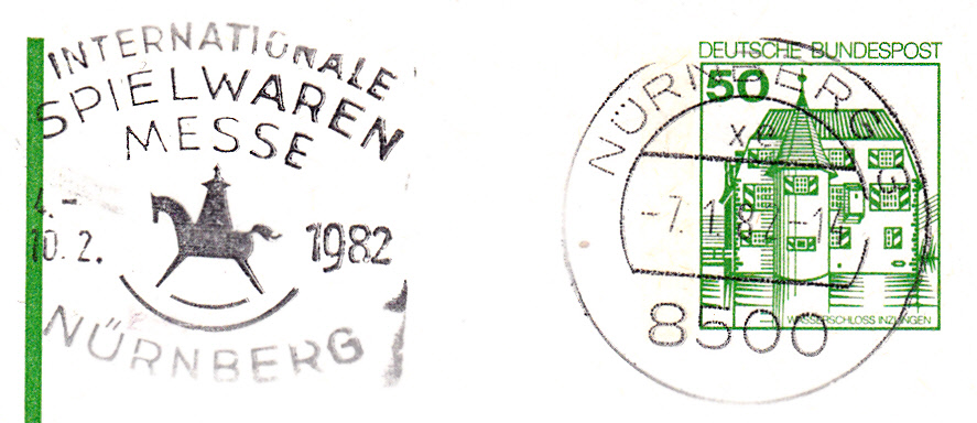 Auch im Jahre 1982 wurde bereits mit diesem bildgleichen Werbeeinsatz im Maschinenwerbestempel von Nürnberg 3 für die Spielwarenmesse geworben, wie dieser Abschlag vom 7.1.1982 zeigt.