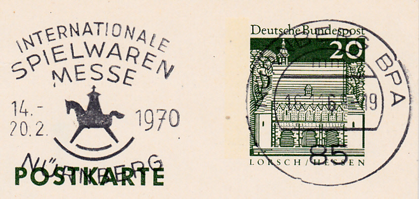 Maschinenwerbestempel vom 16.11.1969 aus 85 Nürnberg BPA Kennbuchstaben "mm" mit Werbung für die Spielwarenmesse 1970.