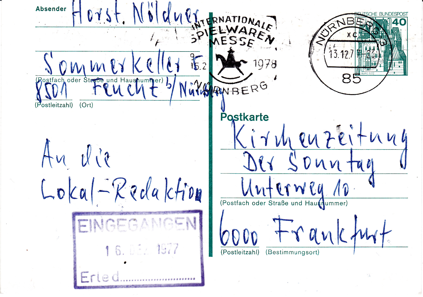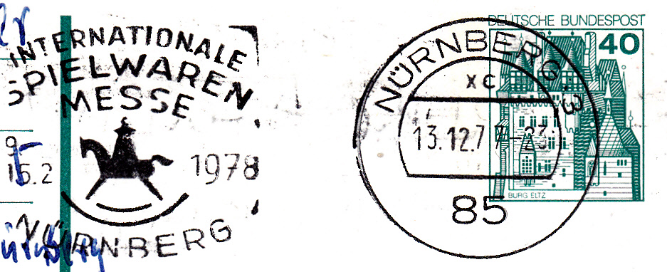 Maschinenwerbestempel vom 13.12.1977 aus 85 Nürnberg 3 Kennbuchstaben "xc" mit Werbung für die Spielwarenmesse 1978.