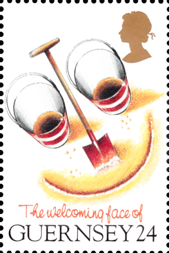 In einer Serie mit "Grußmarken: Lächelnde Gesichter aus landestypischen Produkten" ist auf Guernsey auch diese Marke (MiNr 663) erschienen, die zwei Sandeimer und eine Sandschaufel zeigt.