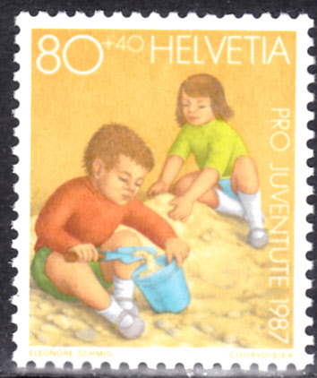 Diese Marke aus der Schweiz (MiNr 1362) zeigt Kinder mit Sandspielzeug.