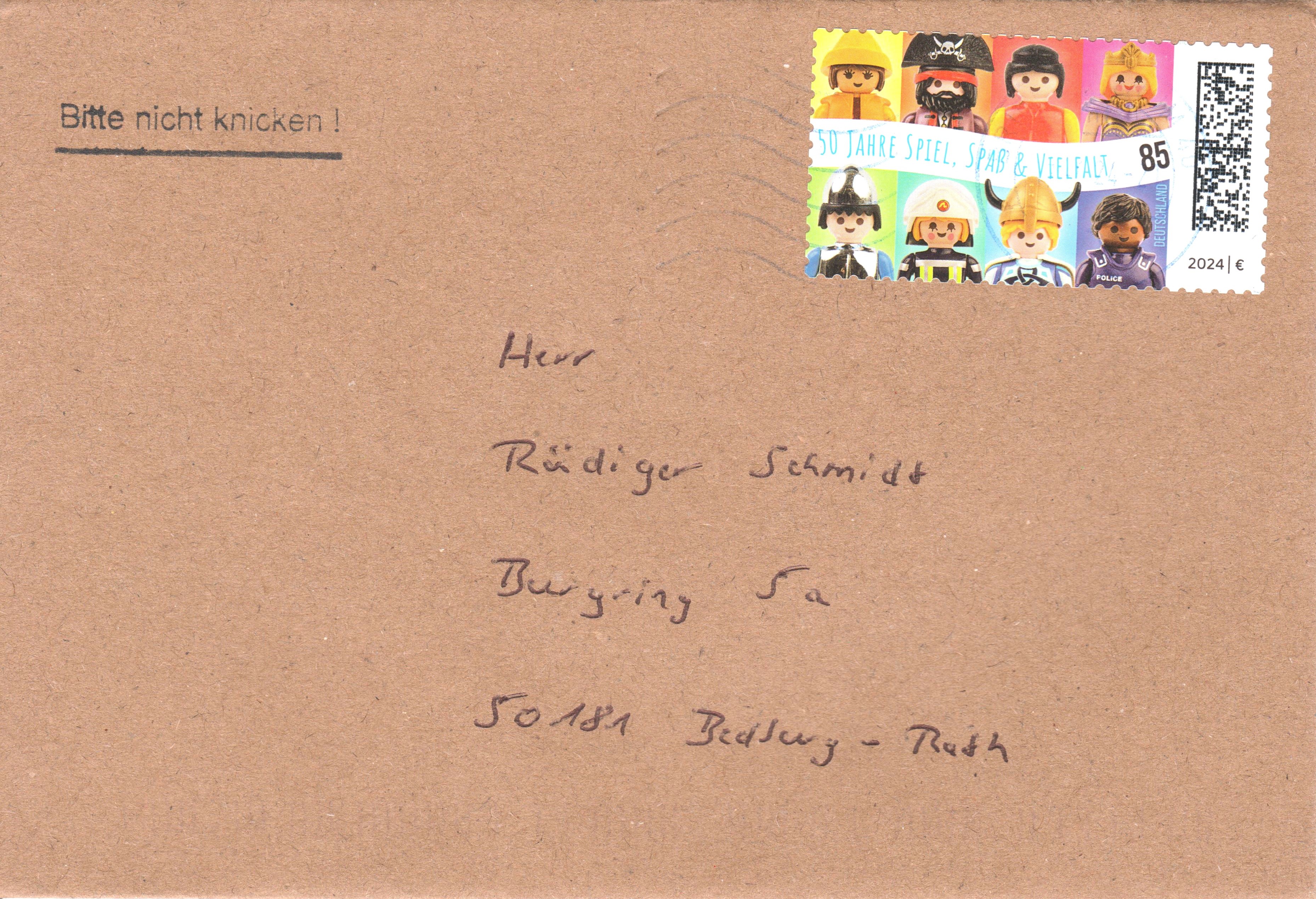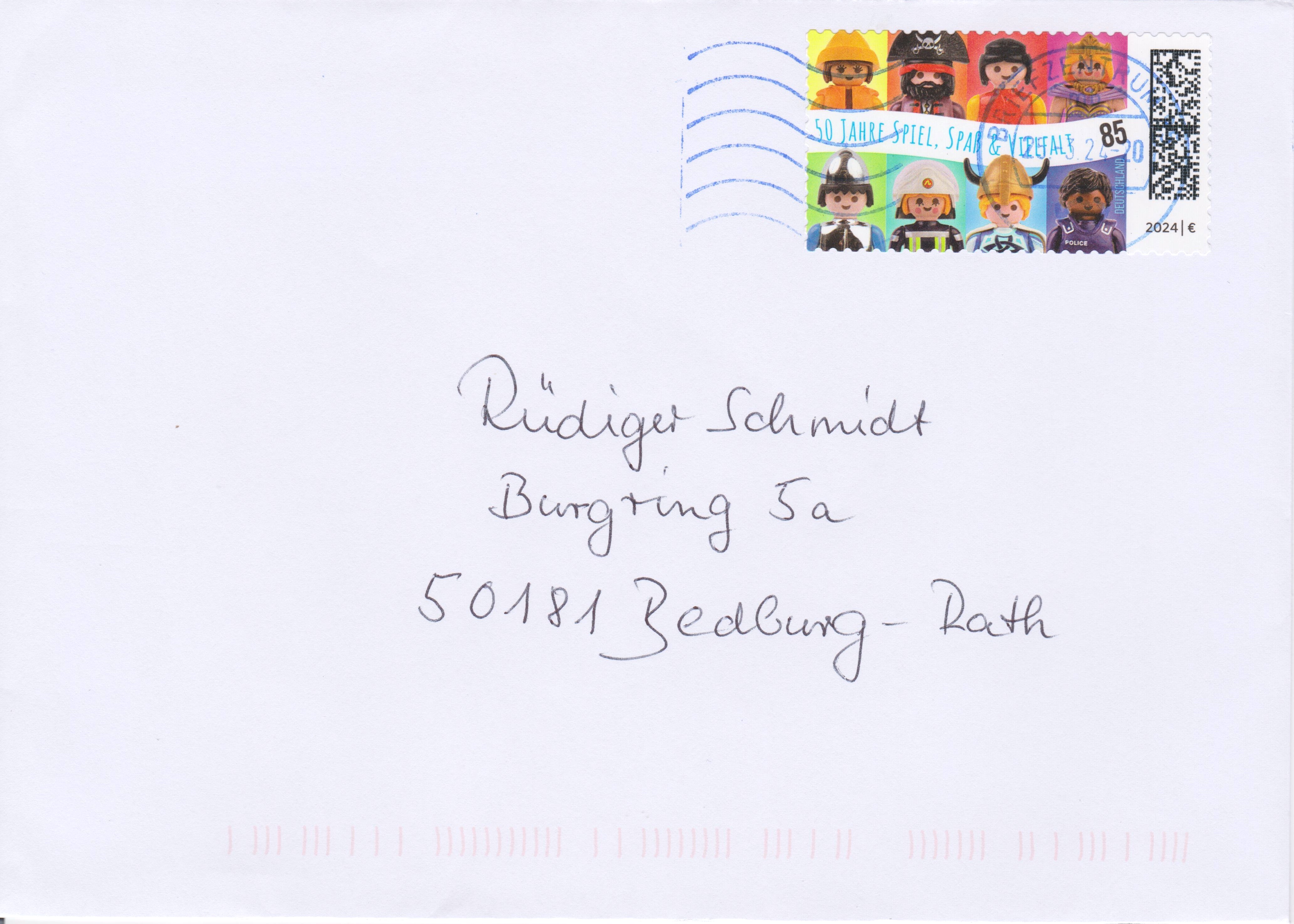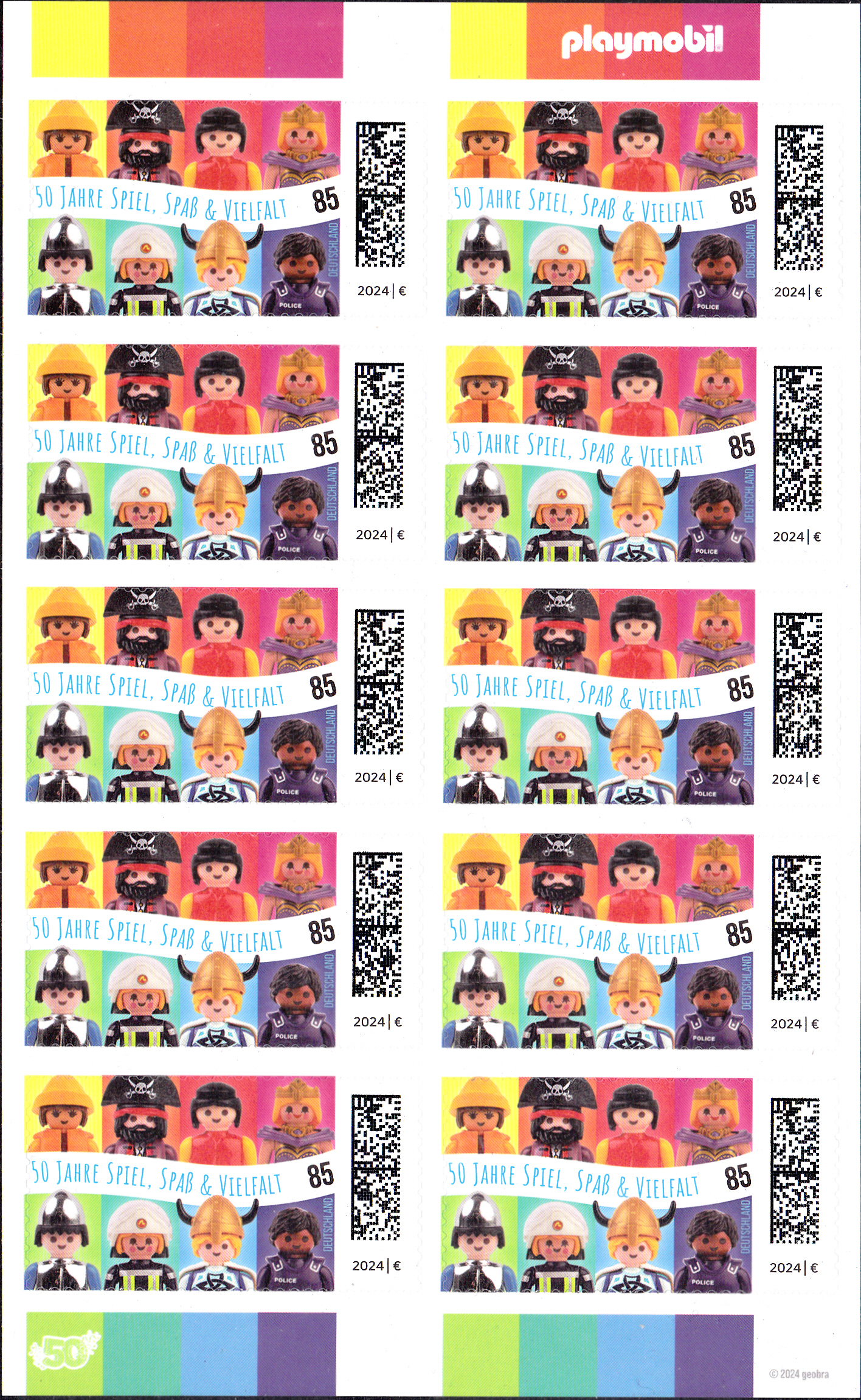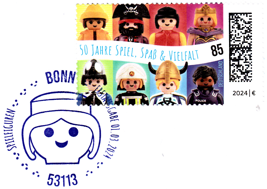 Aus Anlass "50 Jahre Playmobil" ist bei der Deutschen Post eine Marke (MiNr 3821) mit den Playmobil-Spielfiguren Umweltschützerin mit Ölzeug, Pirat, Zivilist, Königin, Ritter, Feuerwehrfrau, Wikinger und Polizist erschienen.