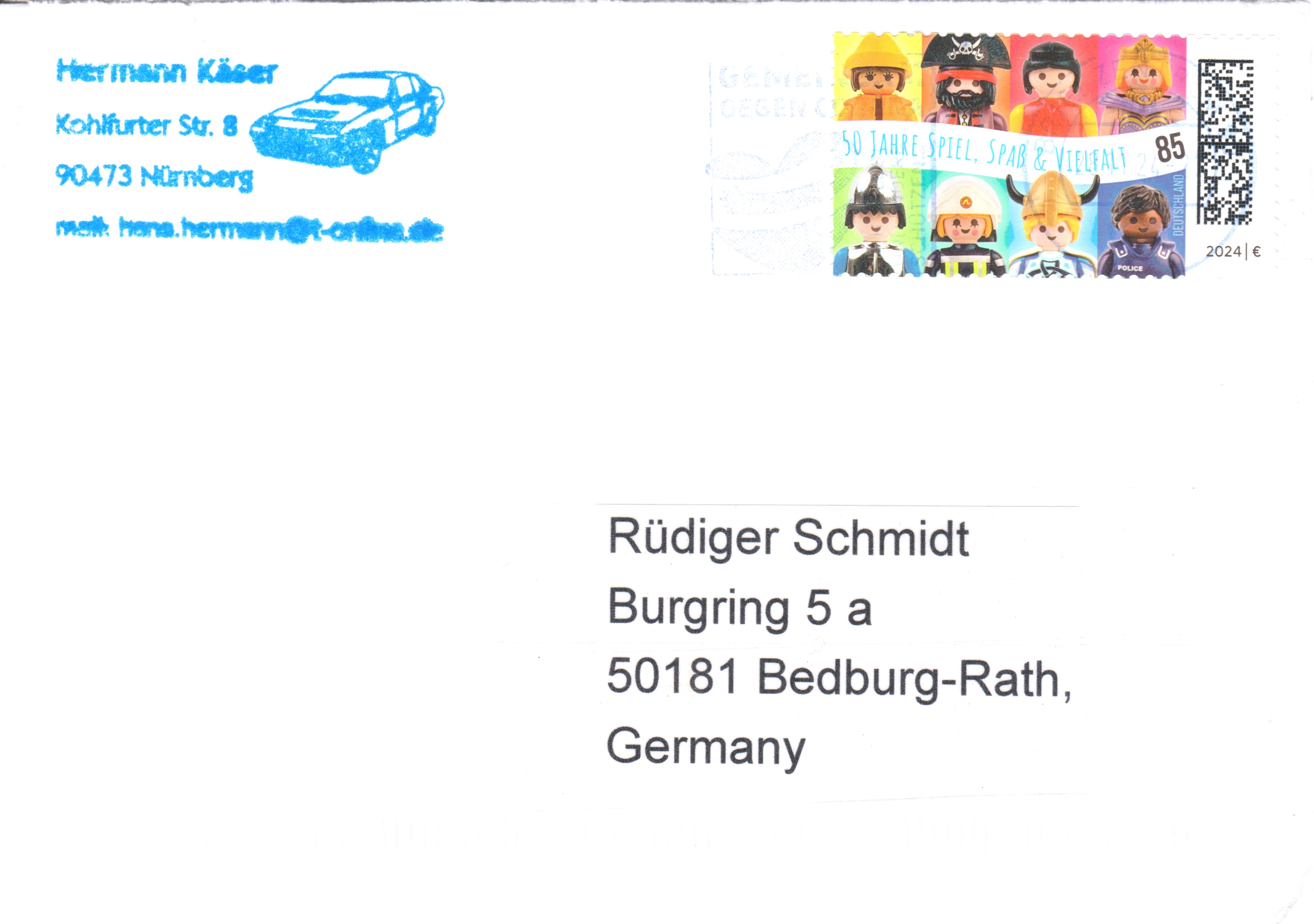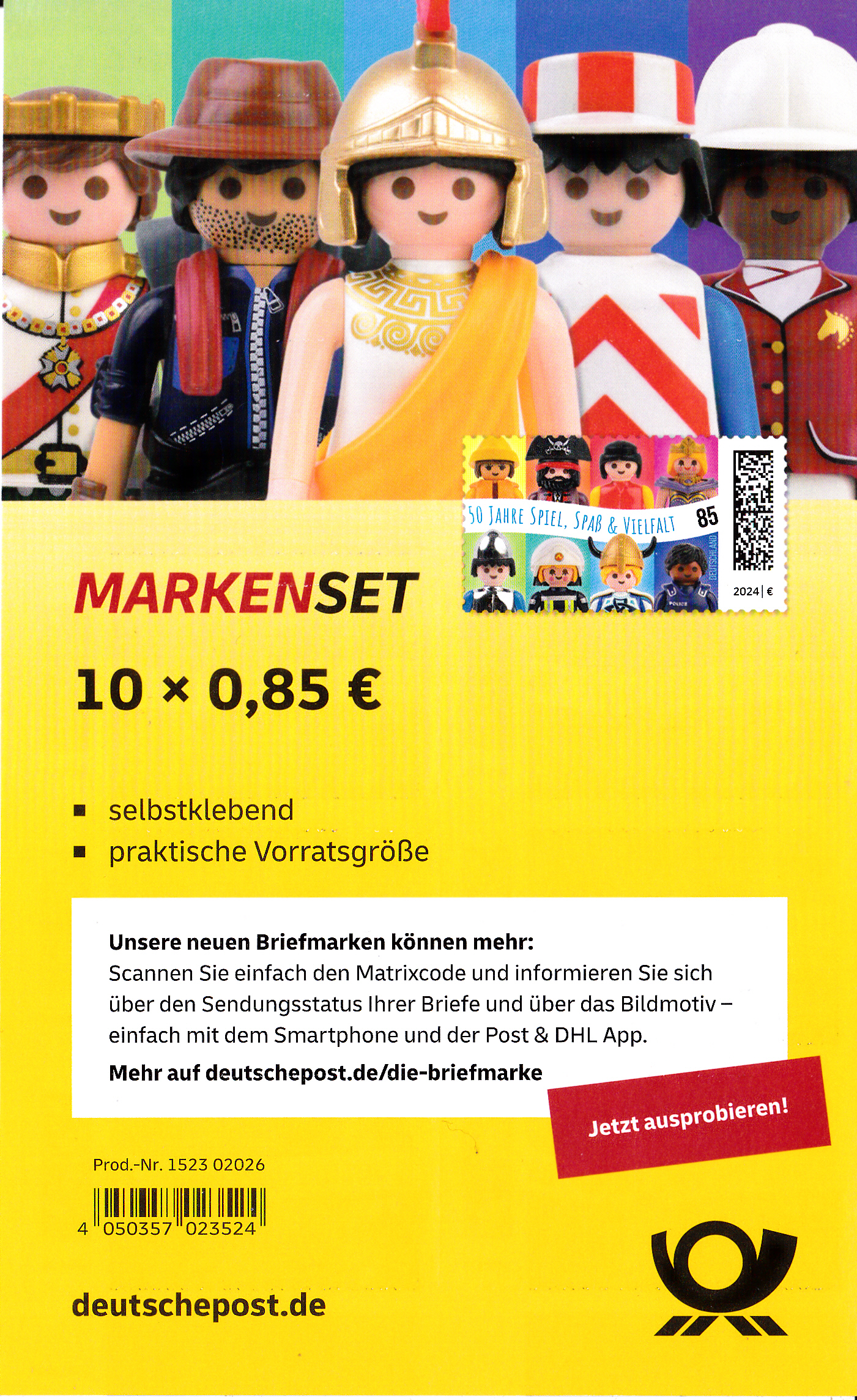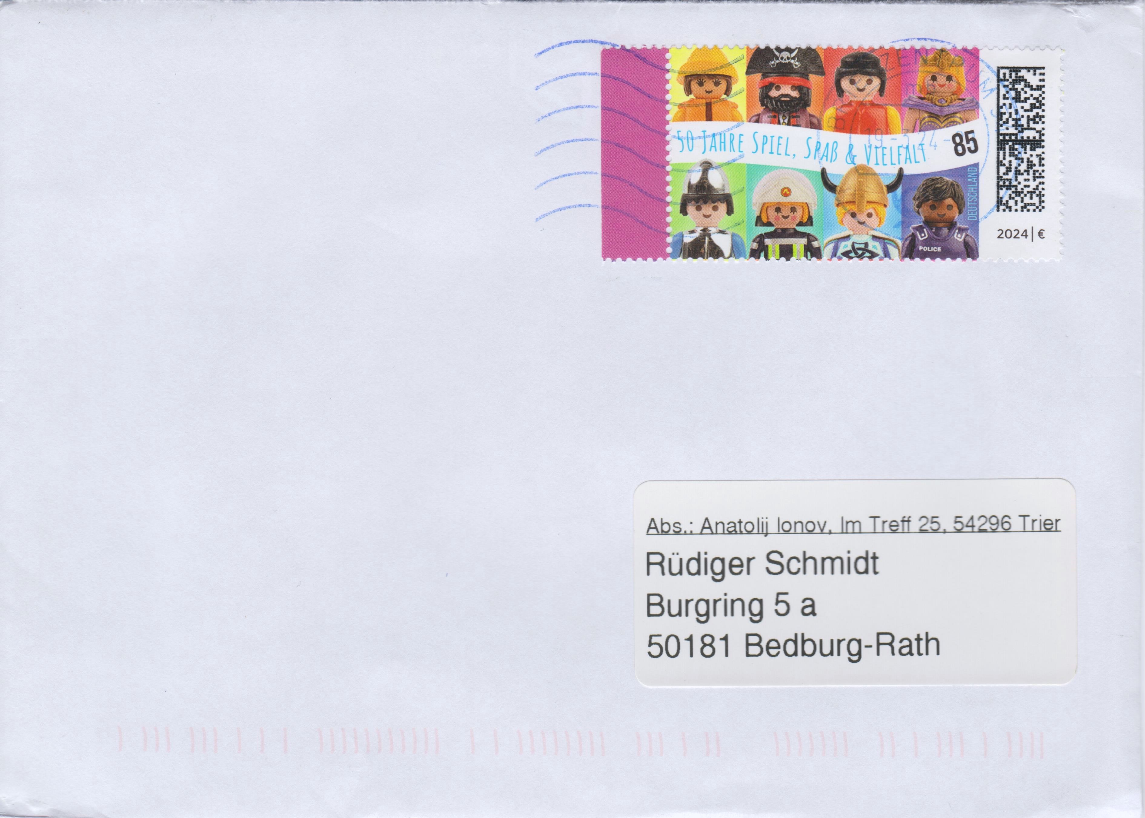 Aus Anlass "50 Jahre Playmobil" ist bei der Deutschen Post eine Marke (MiNr 3821) mit den Playmobil-Spielfiguren Umweltschützerin mit Ölzeug, Pirat, Zivilist, Königin, Ritter, Feuerwehrfrau, Wikinger und Polizist erschienen.