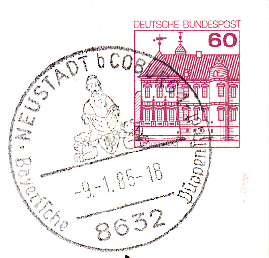 Hier nun ein Handwerbestempel vom 9.1.1985 aus Neustadt bei Coburg, der "Bayerischen Puppenstadt" mit Puppe und zwei Teddybären im Stempelbild.