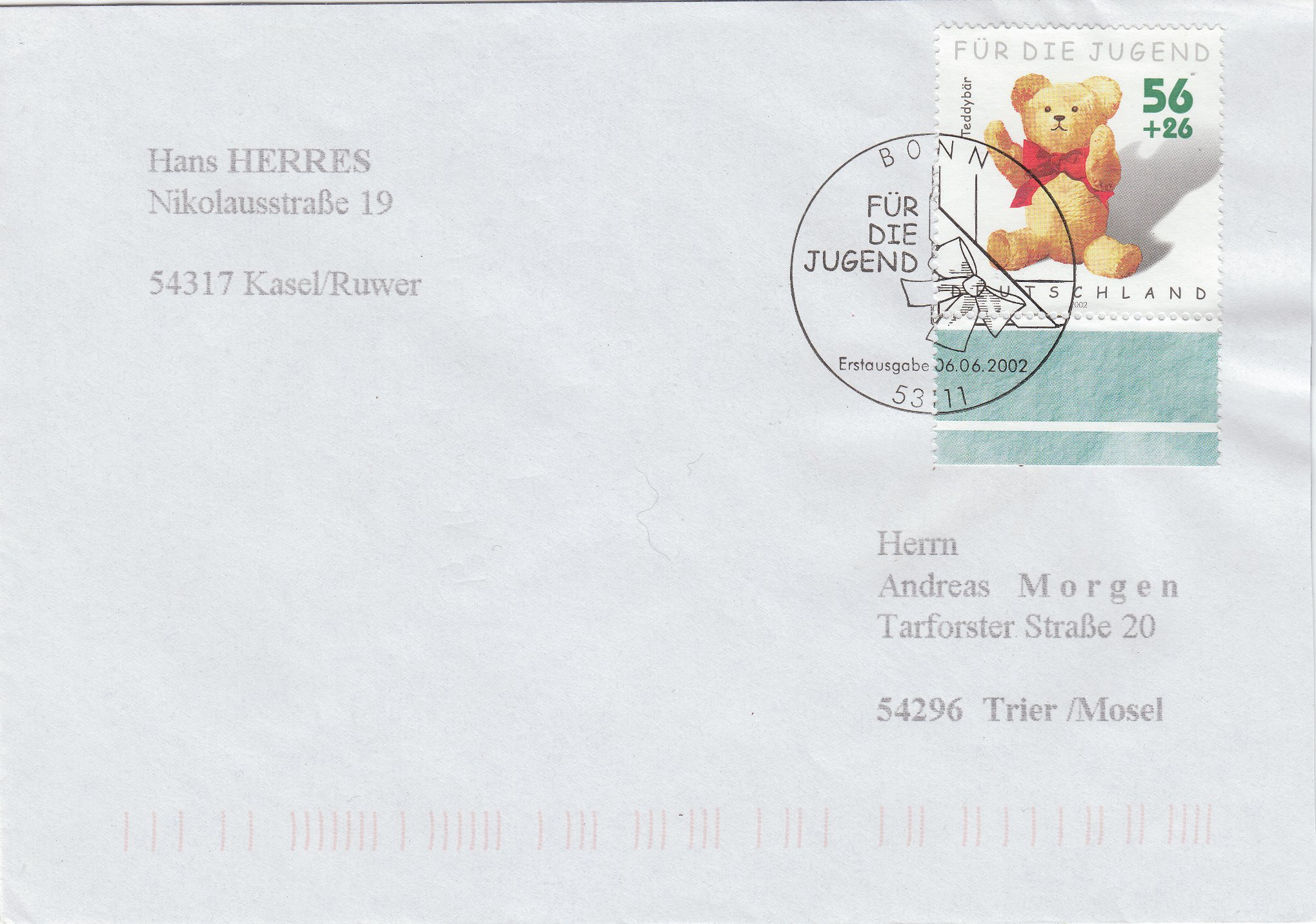 Dieser Sonderstempel vom 30.9.2000 aus Trier zeigt im Stempelbild einen Teddybären. Der Stempel ist auf einer Postkarte zur Anschriftenprüfung verwendet worden. Das Porto für eine Einzelanschriftenprüfung betrug zu dieser Zeit 160 Pfennig.
