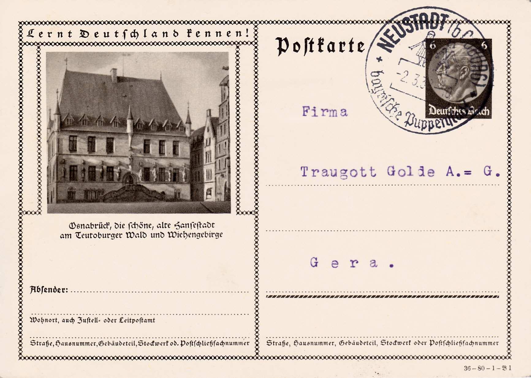 Auf diesem Handwerbestempel aus Neustadt bei Coburg wird mit dem Text "bayrische Puppenstadt" auf die Herstellung von Puppen aufmerksam gemacht und zwei Puppen sind im Stempel abgebildet.