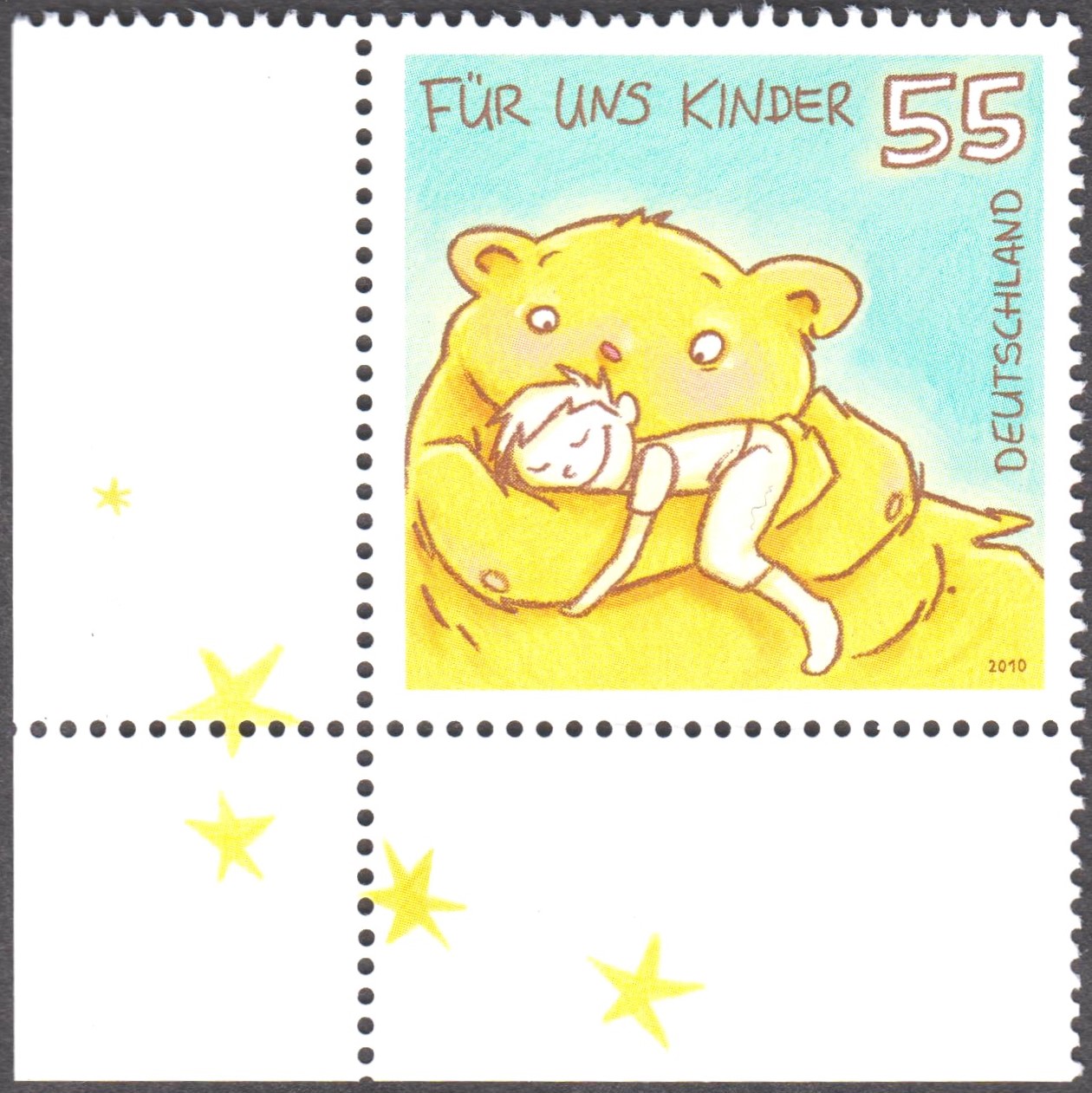Deutsche Post MiNr. 2818, mit dem Motiv "Teddybär Bezi mit dem schlafendem Kim im Arm" als Eckrandtück: