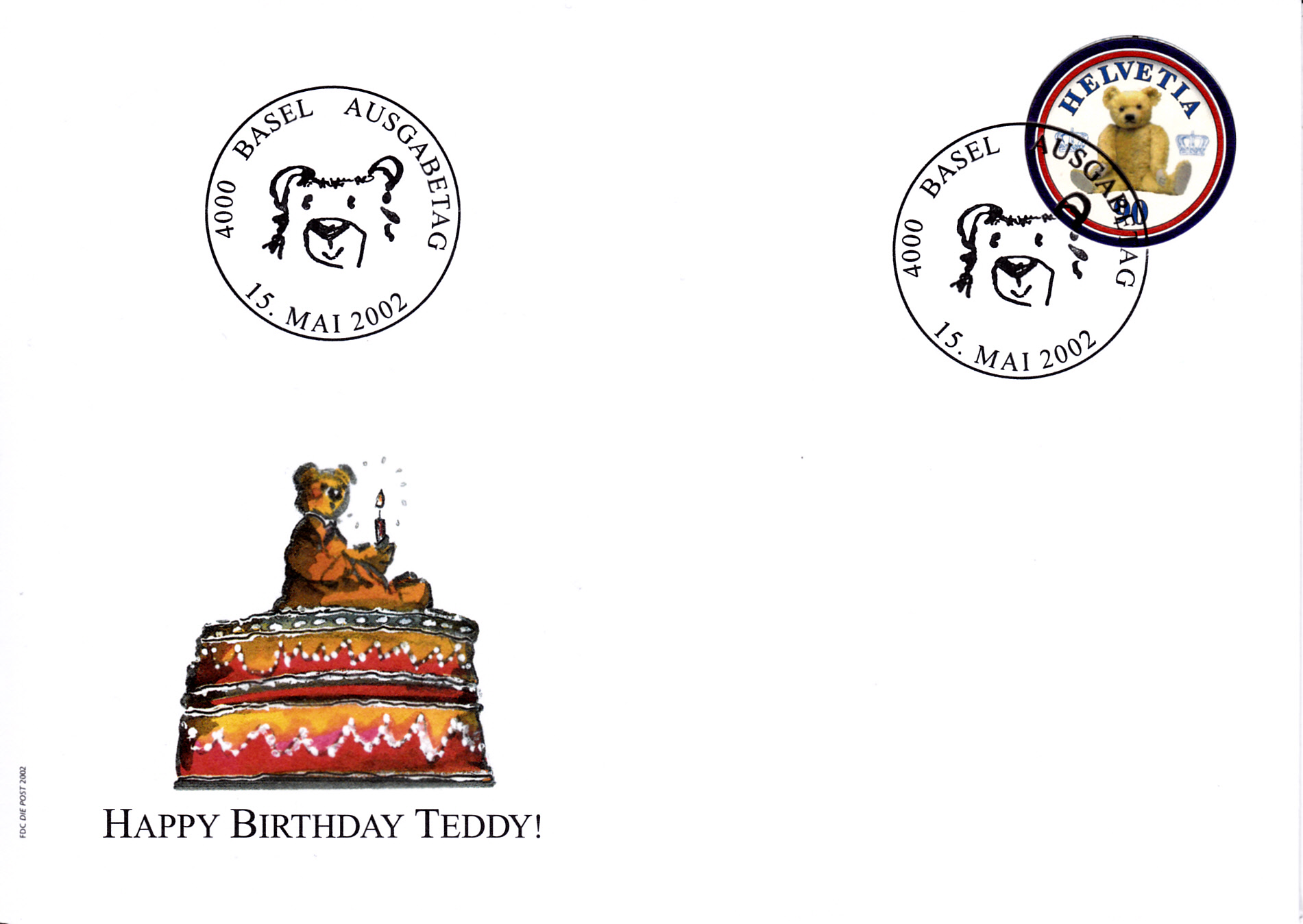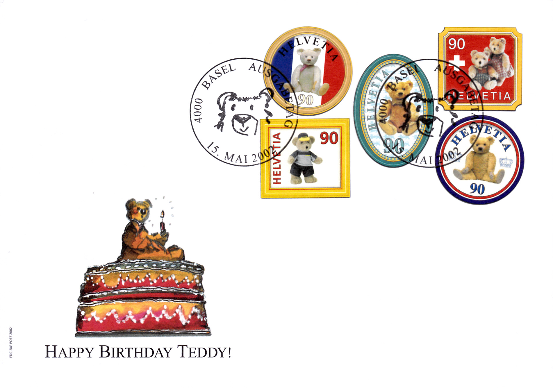 Der nächste FDC zeigt eine rechteckige Marke mit Teddybär.