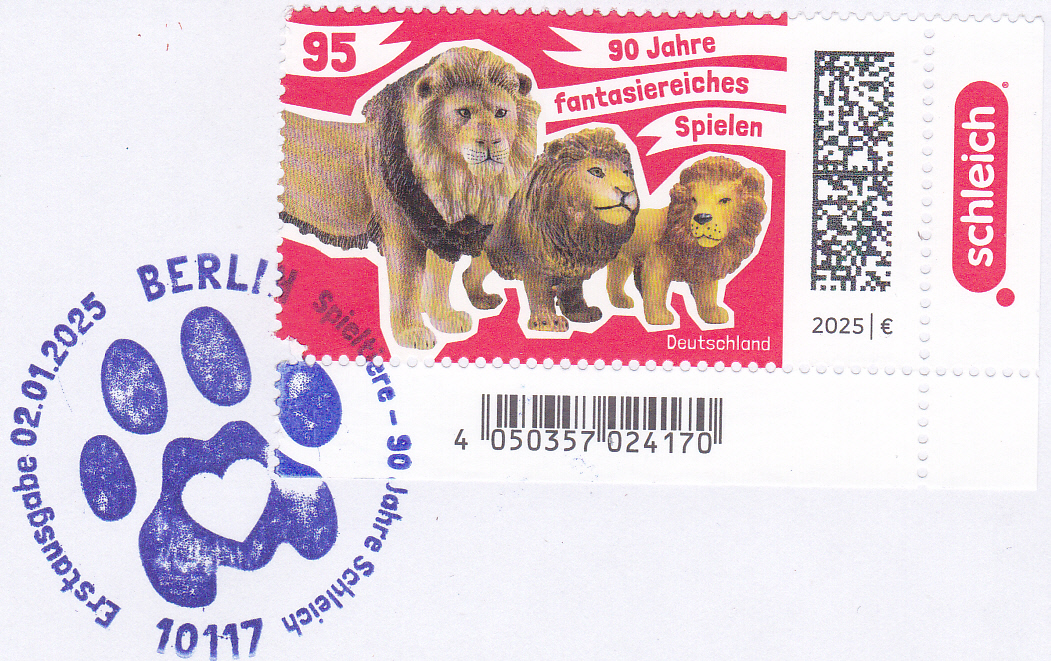 Zum Jubiläum "90 Jahre Schleich" erschien bei der Deutschen Post eine Marke (MiNr 3882)( mit drei Spoelfiguren "Löwen (Panthera leo)" der Firma Schleich aus verschiedenen Produktionszeiträumen. Hier zeige ich eine Marke vom Eckrand mit EAN-Codierung.