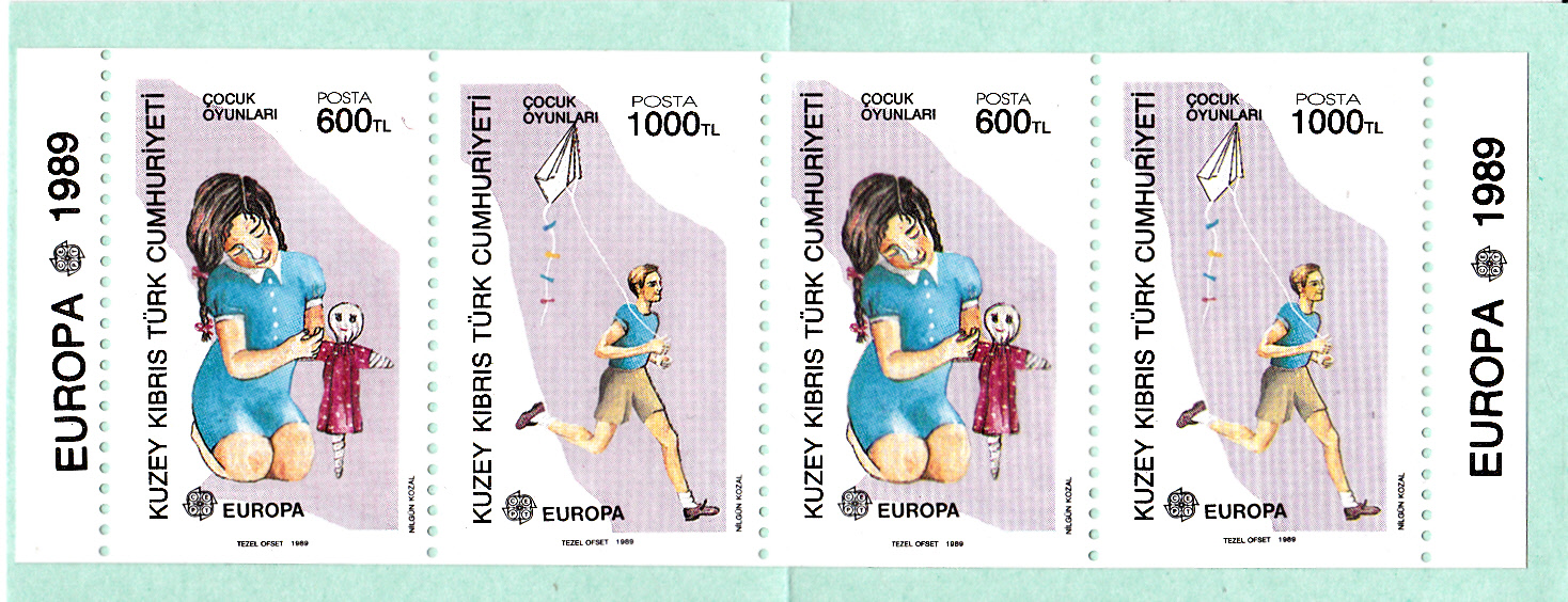 In Türkisch-Zypern erschien die Europamarken 1989 zu 1000 TL zum Gemeinschaftsthema "Kinderspiele" mit der Abbildung "Junge lässt einen Drachen steigen". Von dieser Marke gibt es in zwei Varianten: A = vierseitig gez. K 12 1/4 aus dem Bogen und C = senkrecht gez. 12 1/4 aus Markenheftchen. Hier die Marke (MiNr 250 C) aus einem Markenheftchen.