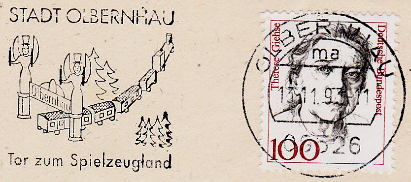 In diesem Maschinenwerbestempel vom 13.11.1993 wird im Werbeeinsatz auf die Fertigung von Holzspielzeug in Olbernhau, wie z.B. Holzeisenbahnen, aufmerksam gemacht.