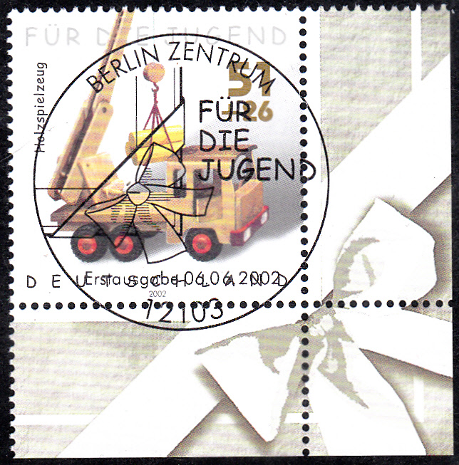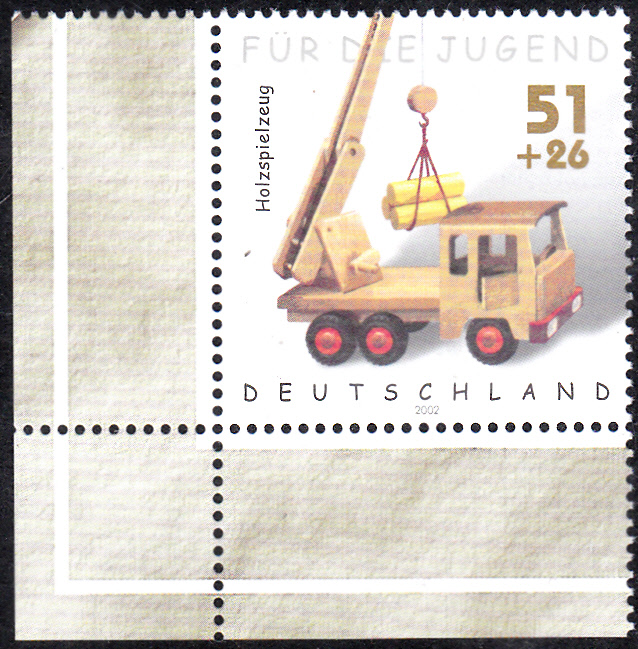 Die Jugendmarken der Deutschen Post aus dem Jahre 2002 erschienen zum Thema Kinderspielzeug. Darunter ist auch eine Marke (MiNr 2261) mit einem Holzspielzeig, genauer einem Kranwagen aus Holz.