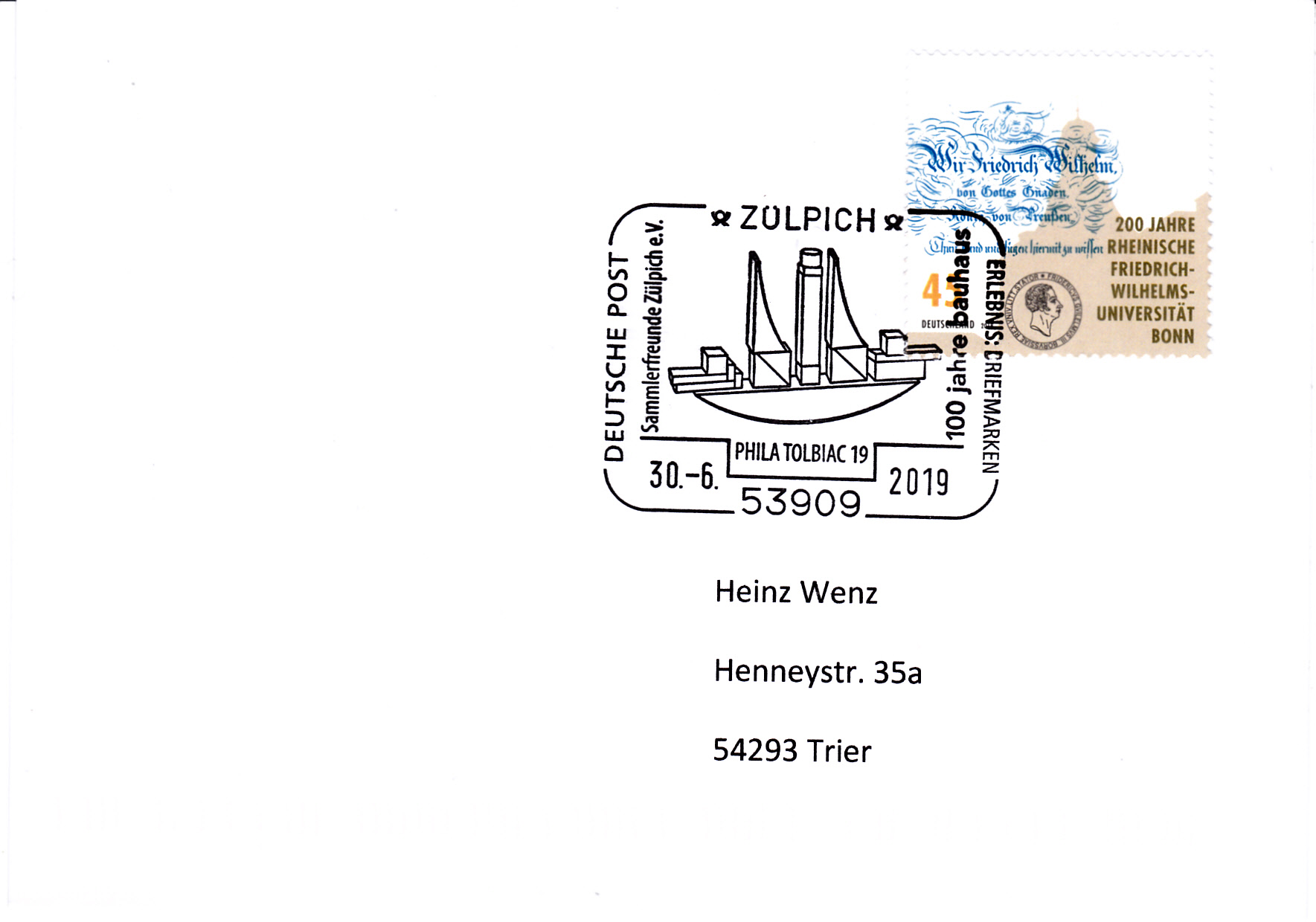 Im Sonderstempel vom 30.6.2019 aus Zülpich wird ein Kleines Schiffbauspiel aus den Produkterfindungen des Bauhauses von der Bauhäuserin Alma Siedhoff-Buscher (geb. 4. Jan. 1899 in Kreuztal bei Siegen; gest. 25. Sep. 1944 in Buchschlag bei Frankfurt am Main) aus dem Jahr 1923 gezeigt.