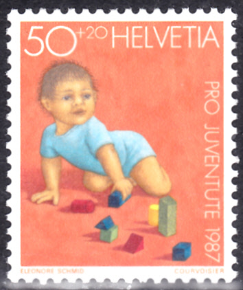 Auf dieser Marke aus der Schweiz (MiNr 1361) sehen wir ein Kleinkind mit Bauklötzchen.