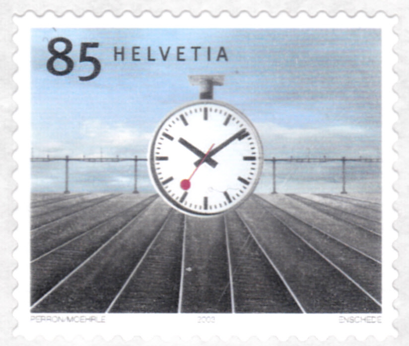 In der gleichen Serie erschien auch diese Marke (MiNr 1862) mit einer "Bahnhofsuhr" nach einem Entwurf aus dem Jahre 1944 von Hans Hilfiker.