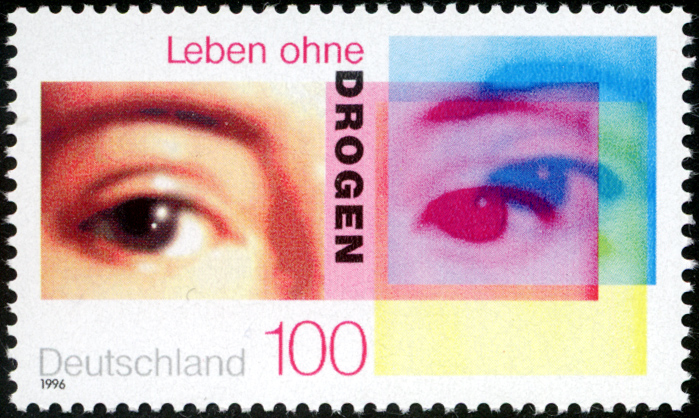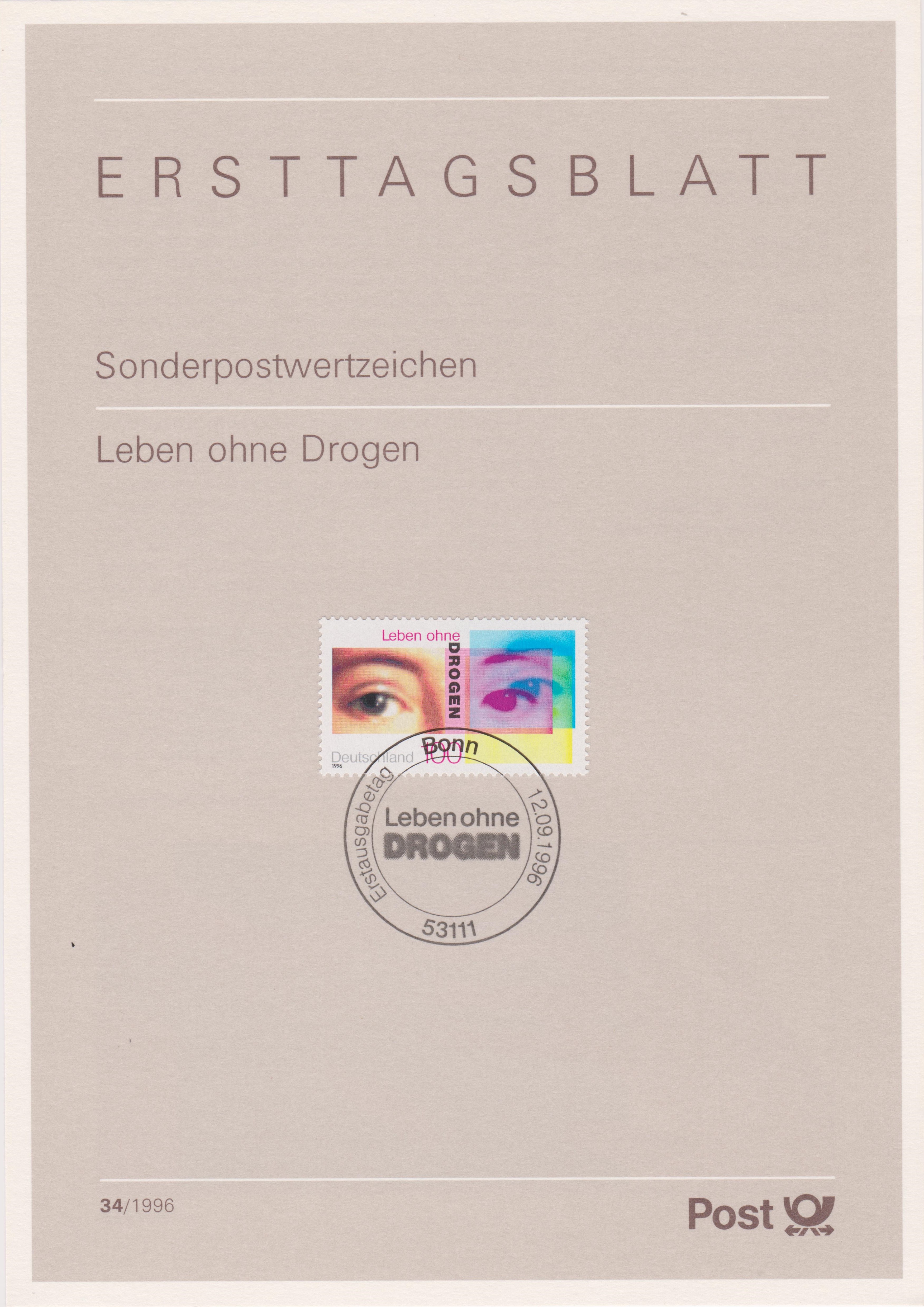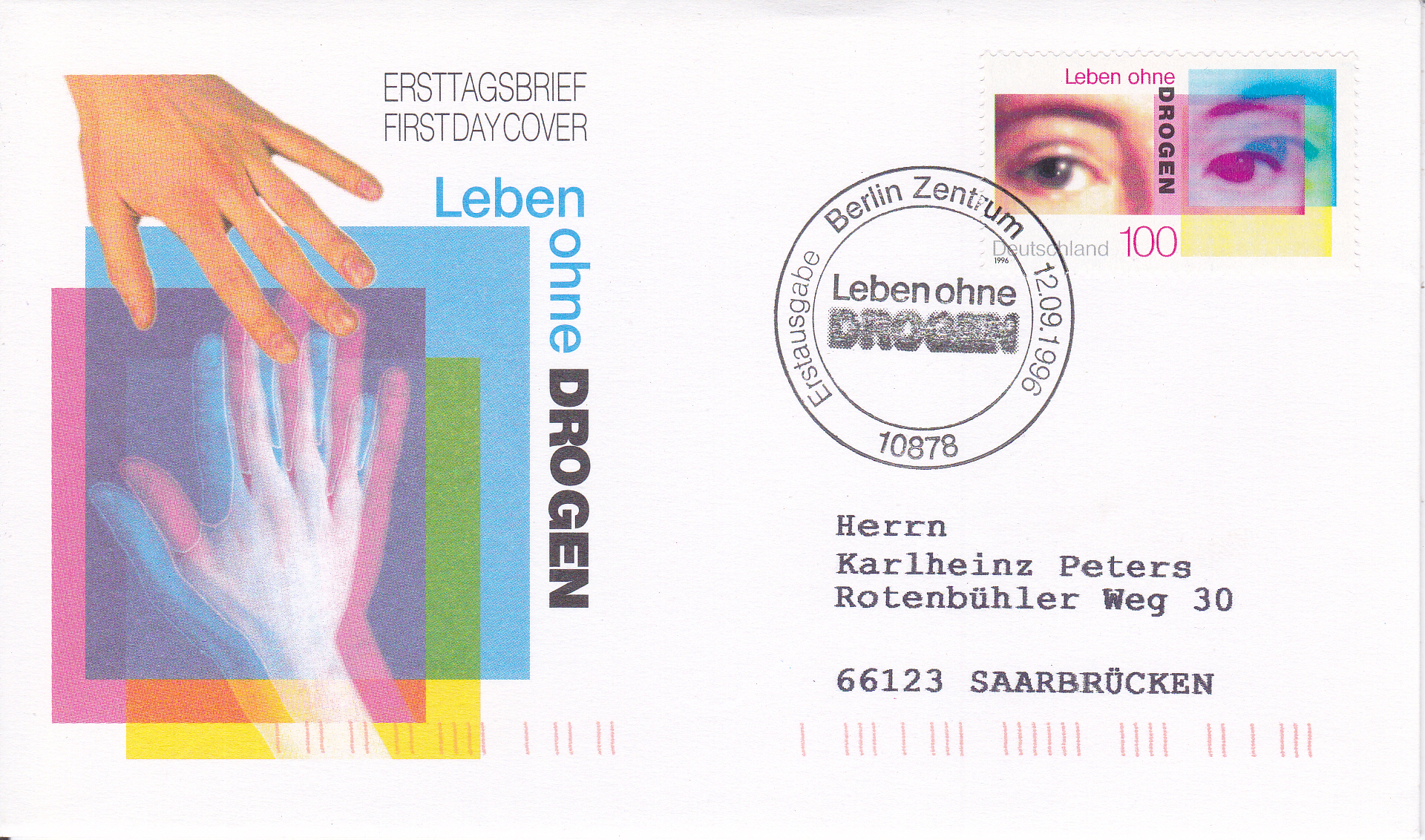 Klappkarte des Vorstandsvorsitzenden der Deutschen Post AG mit der Marke zur Kampagne gegen Drogenmissbrauch (MiNr 1882) und dem Ersttagsonderstempel Bonn.