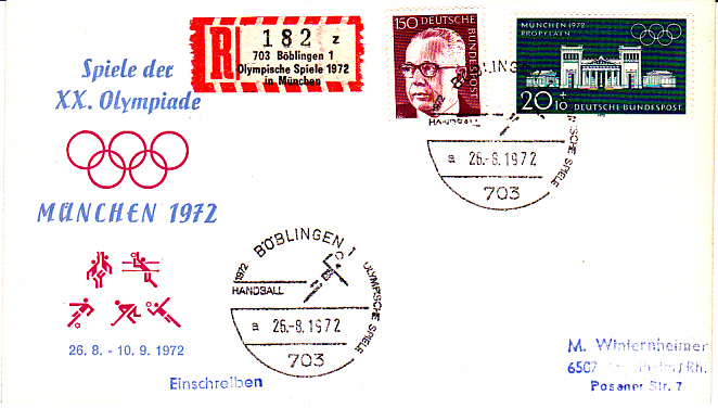 Die Spiele des olympischen Handballturniers fanden nicht nur in München statt sondern auch in anderen Städten. Hier der Sonderstempel auf einem Einschreibebrief aus Böblingen mit Uhrzeit und mit Kennbuchstaben "a" und Sonder-R-Zettel mit dem Zudruck "Olympische Spiele 1972 in München"