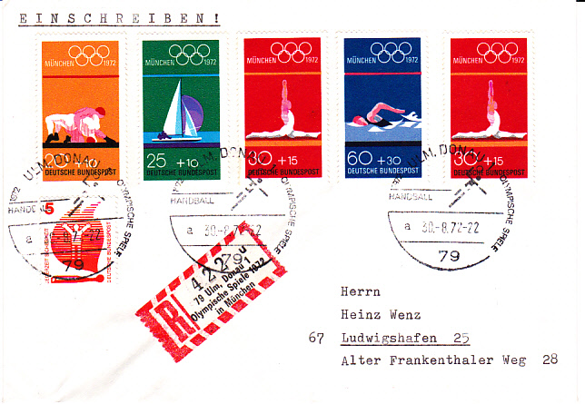 Die Spiele des olympischen Handballturniers fanden nicht nur in München statt sondern auch in anderen Städten. Hier der Sonderstempel Ulm auf einem Einschreibebrief mit Uhrzeit und mit Kennbuchstaben "a" und Sonder-R-Zettel mit dem Zudruck "Olympische Spiele 1972 in München