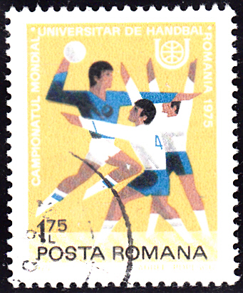 Zu den Handball-Weltmeisterschaft der Studenten 1975 in Bukarest ist in einer Serie in Rumänien diese Marke (MiNr 3245) mit einer Spielszene beim Handball erschienen.