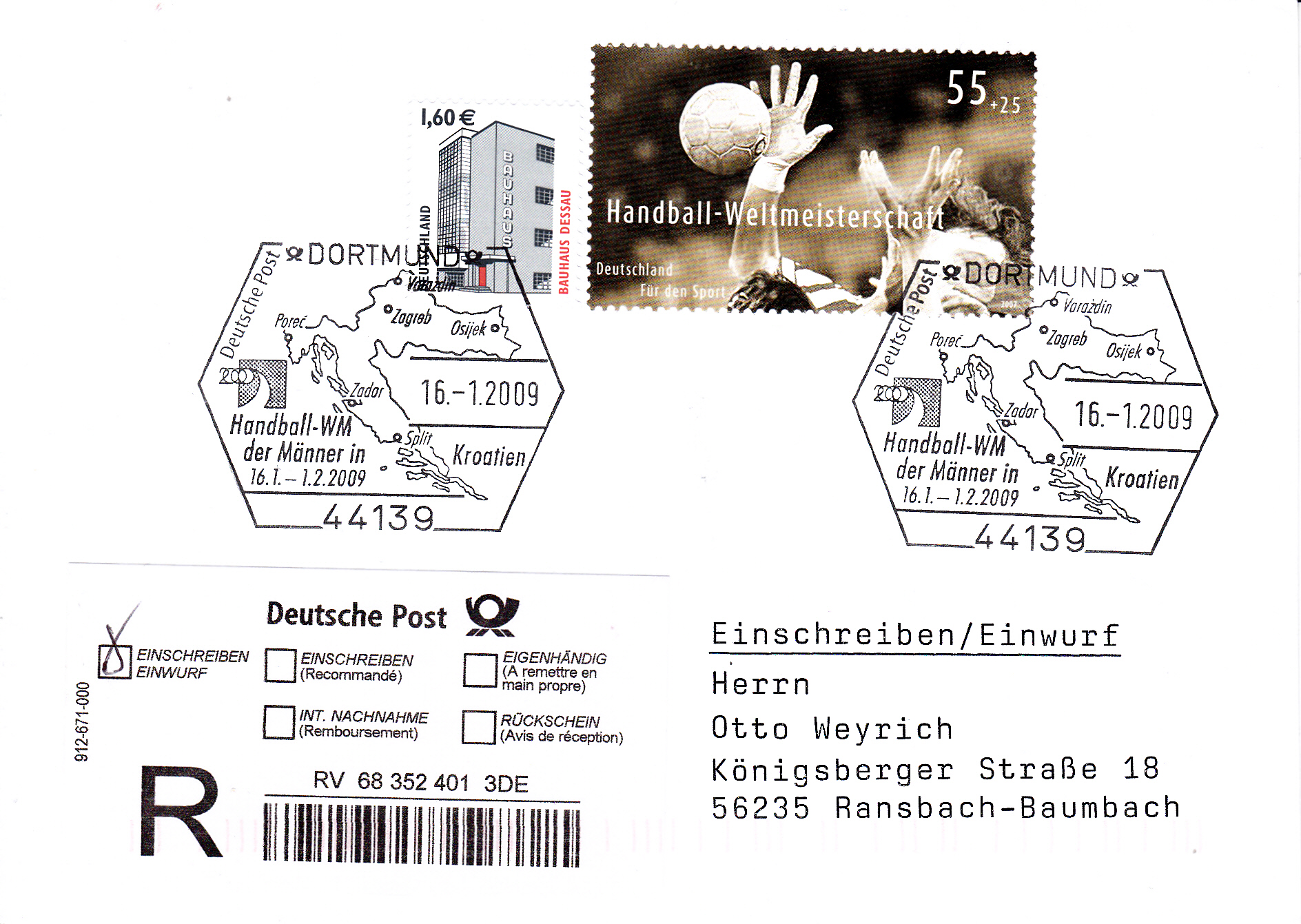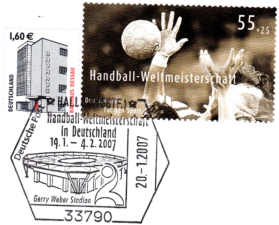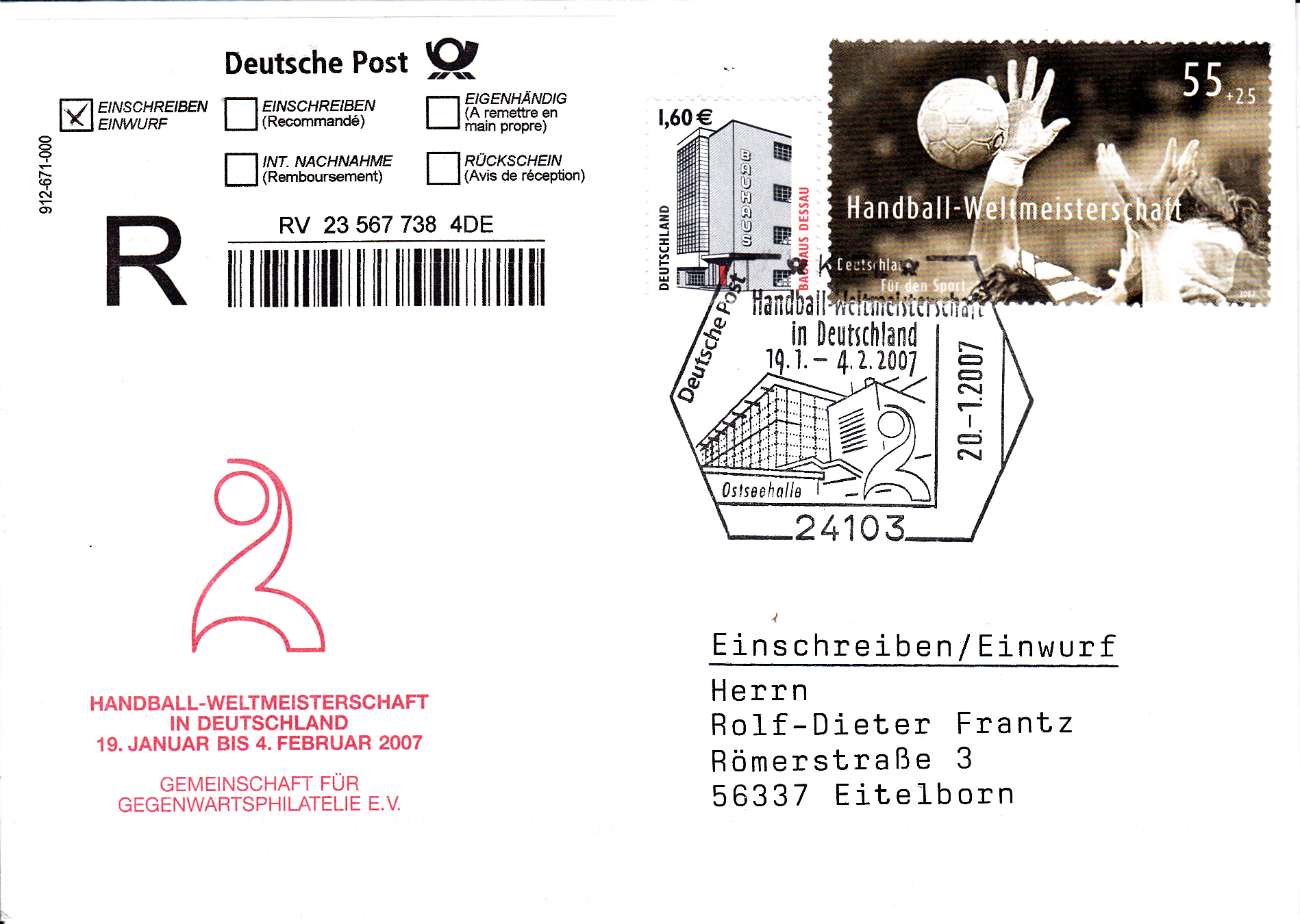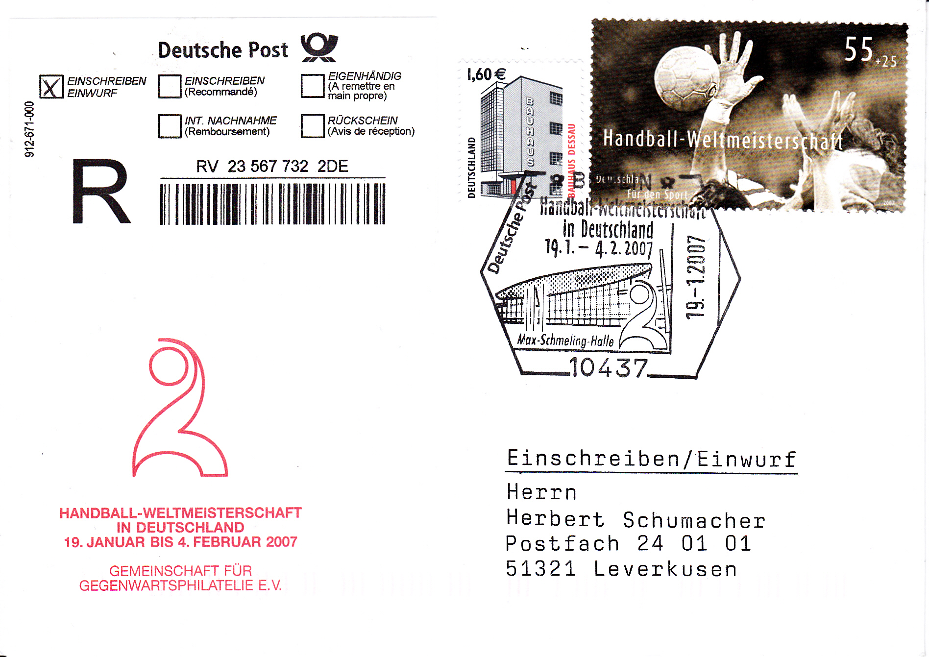 Einwurf-Einschreibebrief vom 19.1.2007 mit der Marke für die Handball-Weltmeisterschaft 2007 (MiNr 2578) und dem Sonderstempel aus Berlin zur Handball-WM 2007 mit dem Stempelbild "Max-Schmeling-Halle". In dieser Halle wurde das Eröffnungsspiel Deutschland– Brasilien 27 : 22 (12:10) am Fr, 19. Januar 2007 um 17:30 Uhr ausgetragen.