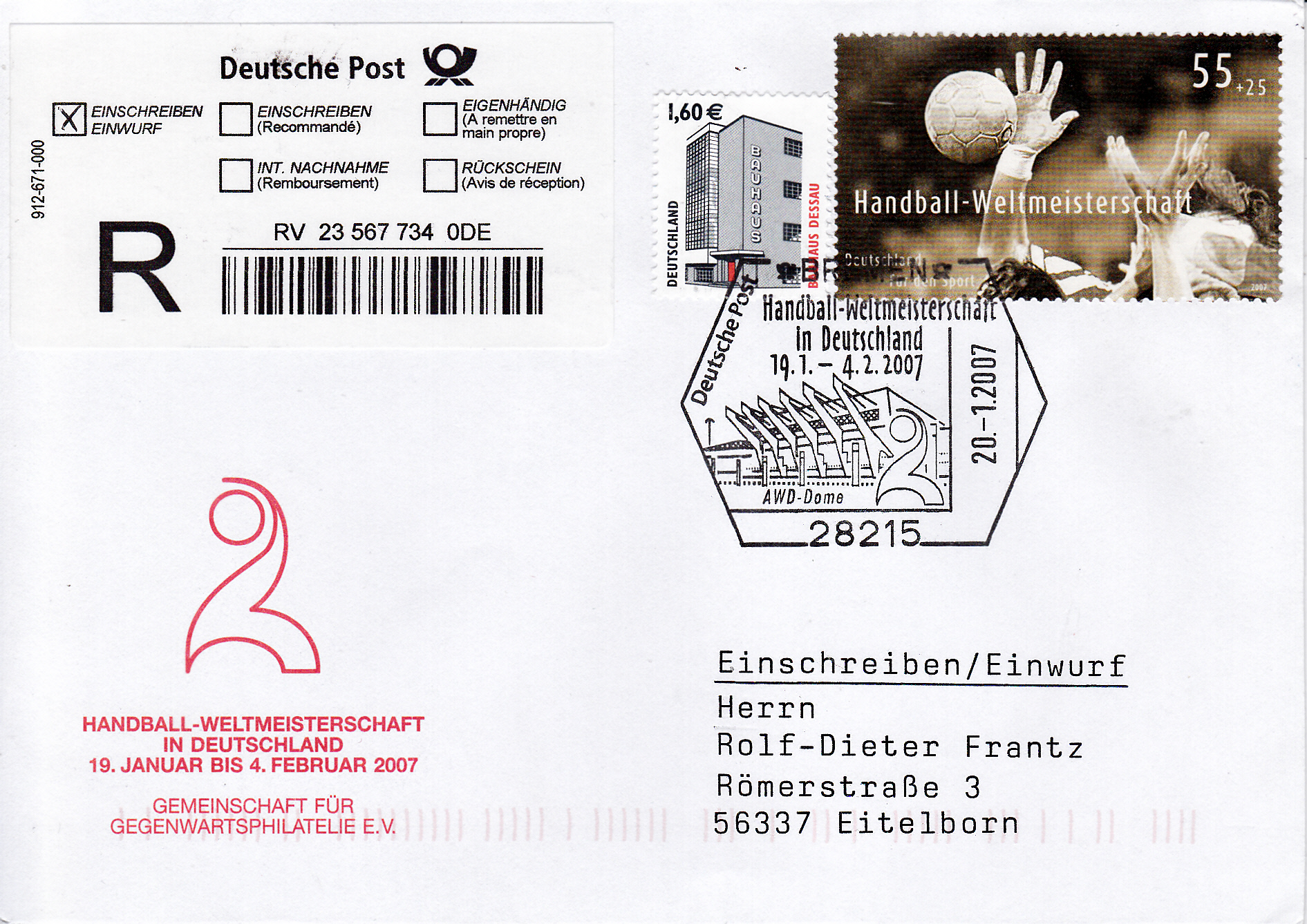 Einwurf-Einschreibebrief vom 20.1.2007 mit der Marke für die Handball-Weltmeisterschaft 2007 (MiNr 2578) und dem Sonderstempel aus Bremen zur Handball-WM 2007 mit dem Stempelbild "Stadthalle Bremen" (von 2005 bis 2009 "AWD Dome"). In dieser Halle wurden die Spiele der Gruppe D ausgetragen.