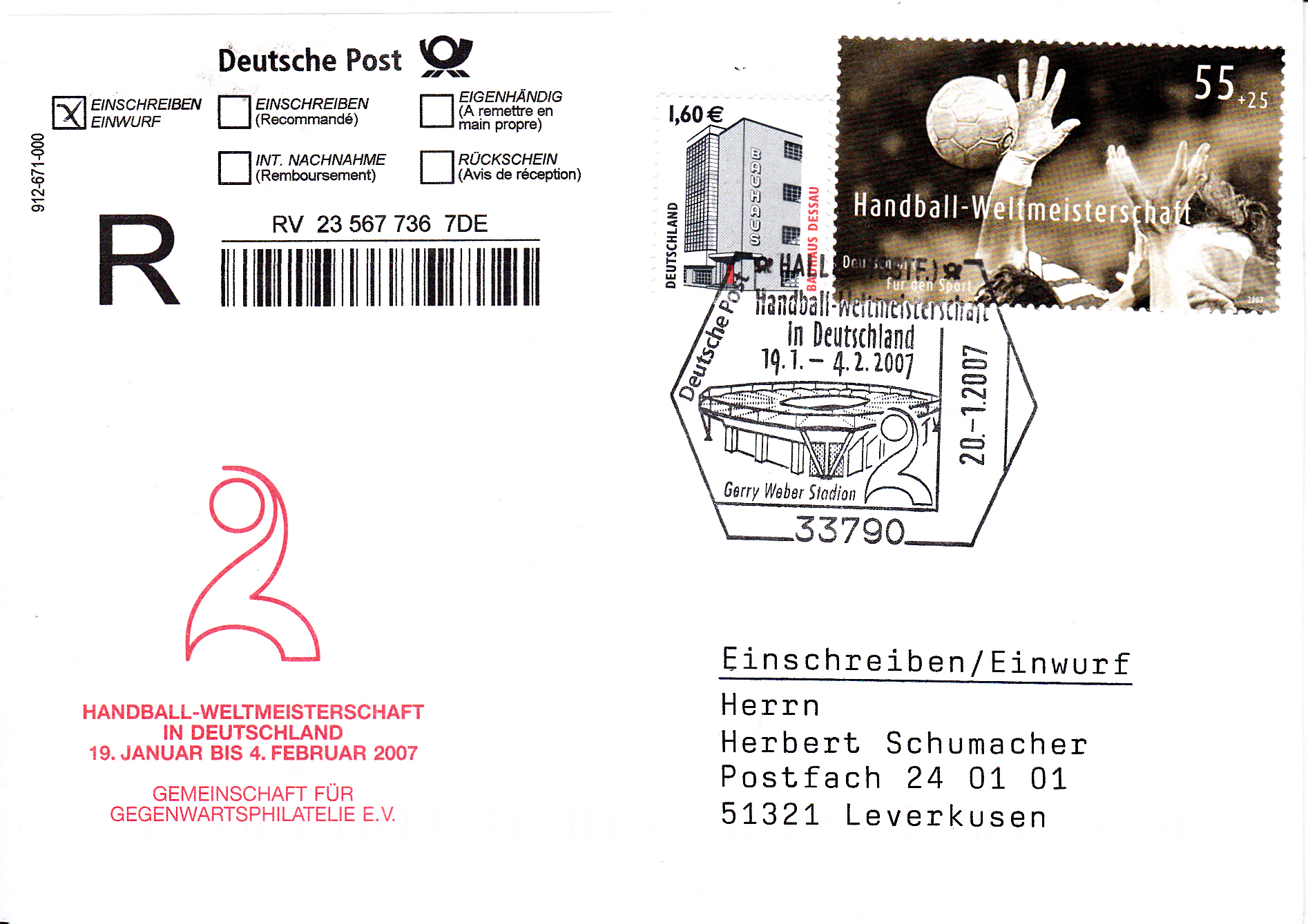 Einwurf-Einschreibebrief vom 20.1.2007 mit der Marke für die Handball-Weltmeisterschaft 2007 (MiNr 2578) und dem Sonderstempel aus Halle (Westfahlen) zur Handball-WM 2007 mit dem Stempelbild "Gerry Weber Stadion". In dieser Halle wurden Spiele der Gruppe c und der Gruppen III und IV (President’s Cup (Plätze 13–24)) ausgetragen.