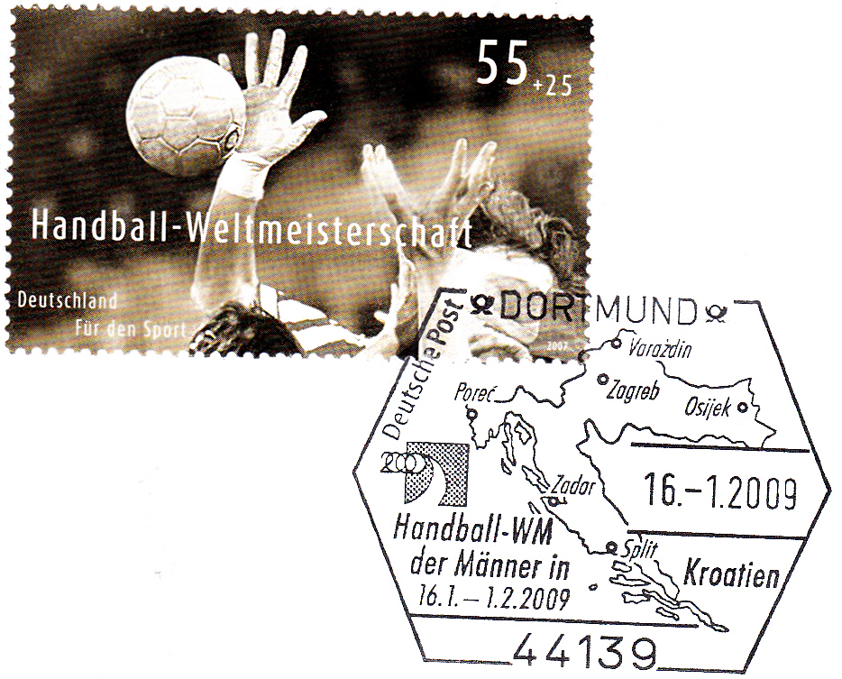 Sonderstempel aus Dortmund vom 16.1.2009 zur Handball-WM der Männer in Kroatien. Im Stempelbild sind eine Landkarte von Kroatien mit den Spielorten und dem Emblem der WM zu sehen.