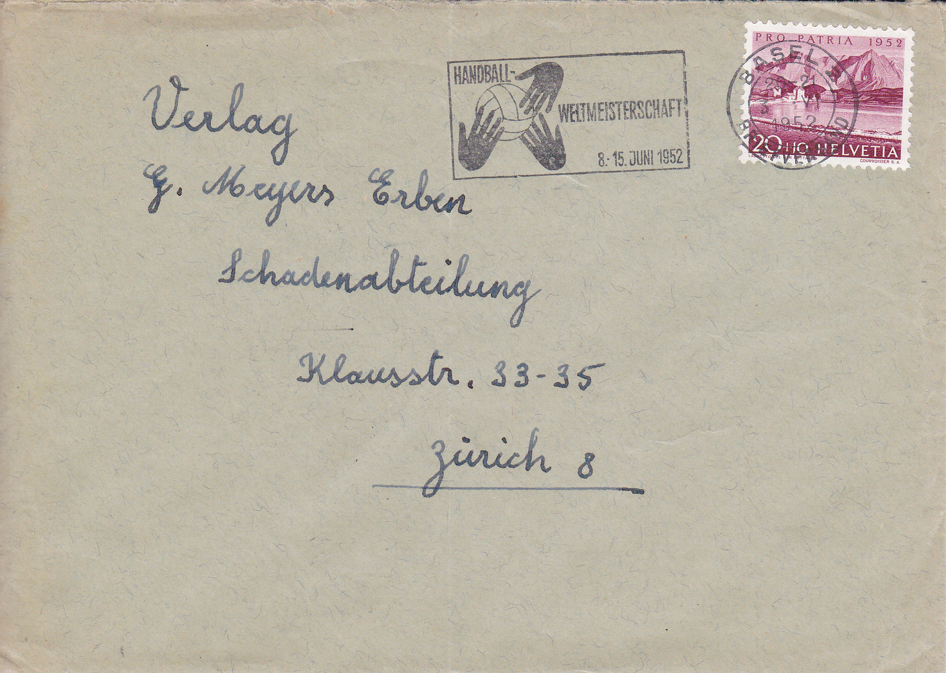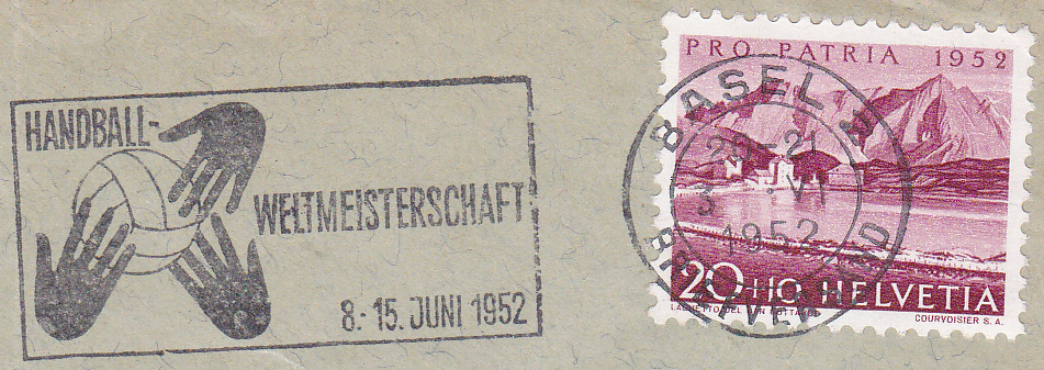 Dieser Maschinenstempel aus Basel vom 3.6.1952 wirbt für diese Handball-Weltmeisterschaft.