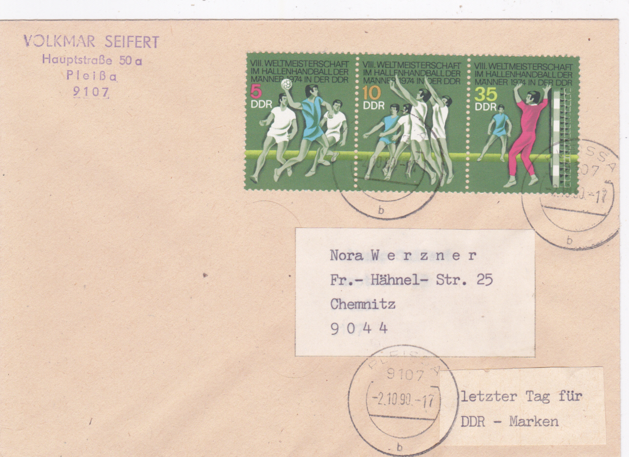 Dieser Brief von Pleißa nach Chemnitz wurde am 2. 10. 1990, dem letzten Gültigkeitstag der Marken in DDR-Währung (da am 3. Oktober 1990 der Beitritt der DDR zur BRD vollzogen wurde), mit dem Zusammendruck zur Hallenhandball-Weltmeisterschaft der Männer 1974 (MiNr W Zd 299) frankiert.