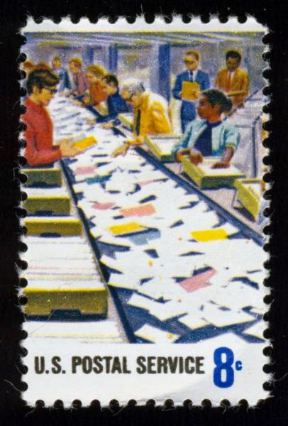 Dieses Postwertzeichen aus den USA zeigt die manuelle Briefsortierung am Fließband: