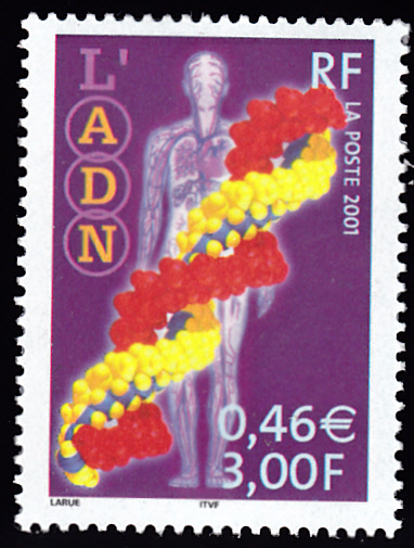 In einer Serie "Wissenschaftliche Ereignisse im 20. Jahrhundert" ist in Frankreich auch diese Marke (MiNr 3562) zum Thema "Entschlüsselung des genetischen Kodes" mit einer Abbildung zur DNA erschienen.