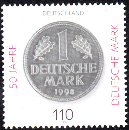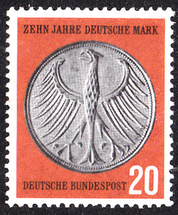 Bei der Deutschen Bundespost erschien am 20.Juni 1958 eine Marke (MiNr 291" zu "10 Jahre Deutsche Mark" mit der Abbildung der Wappenseite eines 5-DM-Stückes.