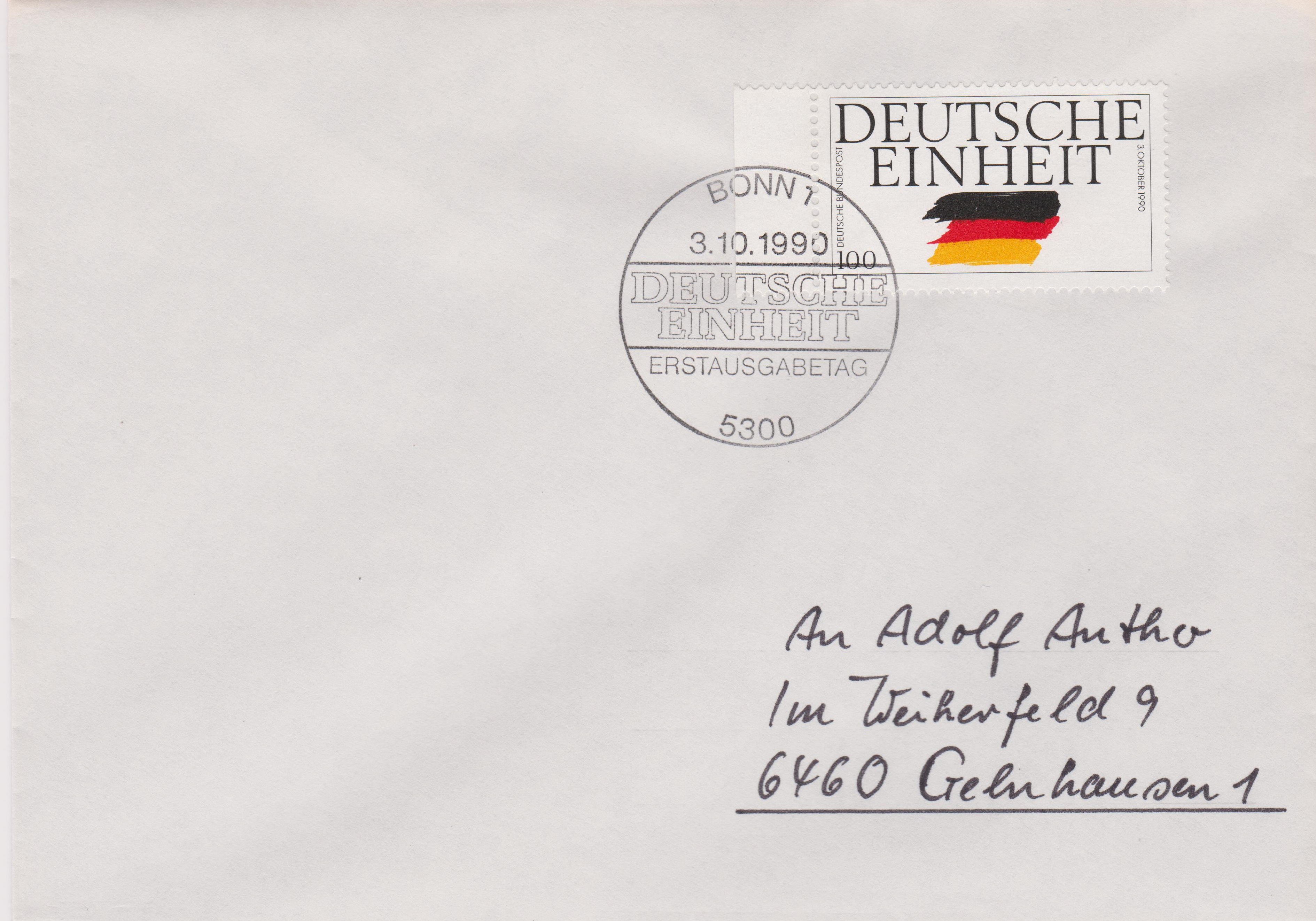 Diese deutsche Briefmarke erschien am 3. Oktober 1990 aus Anlass der Wiedervereinigung (Tag der Deutschen Einheit) und stellt die erste gesamtdeutsche Ausgabe dar: