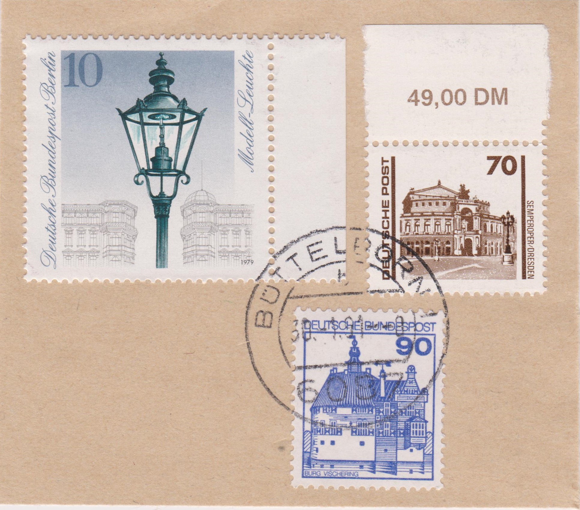 Briefstück mit den vom 02.07.1990 bis zum 31.12.1991 im gesamten wiedervereinigten Deutschland gültigen Postwertzeichen "DEUTSCHE BUNDESPOST", "Deutsche Bundespost Berlin" sowie "DEUTSCHE POST" (= DDR) am 30.01.1991 auf Briefstück mit Tagesstempel "6087 BÜTTELBORN 1":