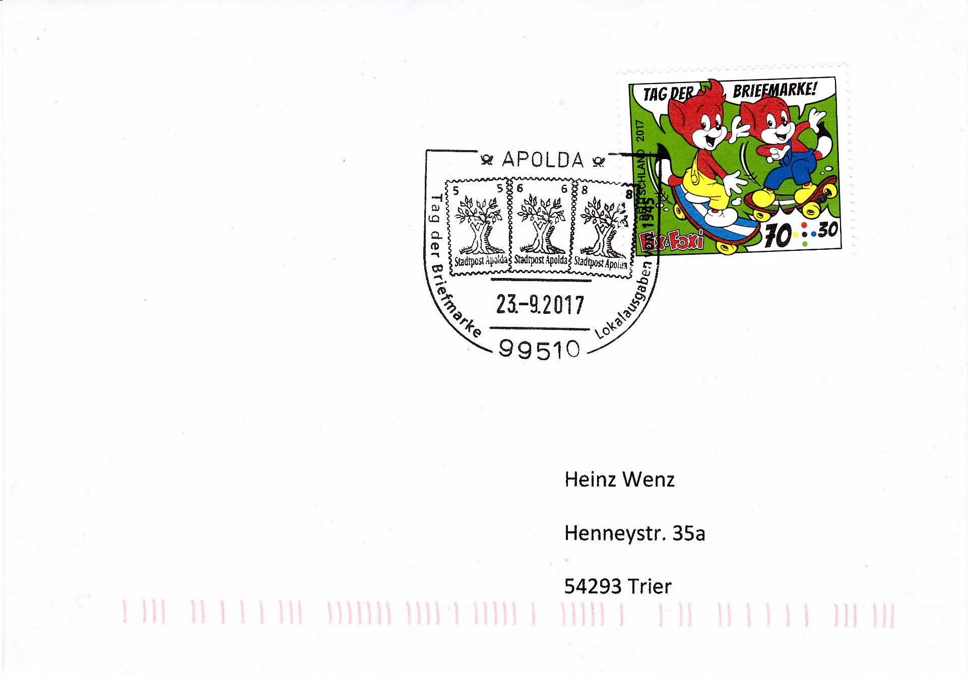 Der Sonderstempel zum Tag der Briefmarke 2017 des Landesverbandes Sachsen-Anhalt vom 14.10.2017 aus Stendal erinnert auch an Johann Joachim Winkelmann (geb. 9. Dezember 1717 in Stendal; gest. 8. Juni 1768 bei Triest, deutscher Archäologe, Bibliothekar, Antiquar und Kunstschriftsteller der Aufklärung). Für Winckelmann war der im Stempelbild gezeigte Apollo von Belvedere "das höchste Ideal der Kunst unter allen Werken des Altertums".