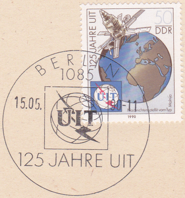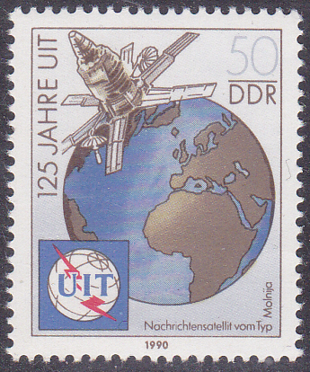 Eine Marke aus der DDR (MiNr 3335) zum Thema "125 Jahre Internationale Fernmeldeunion (ITU)" zeigt einen Nachrichtensatelliten vom Typ Molnija vor der Erdkugel.