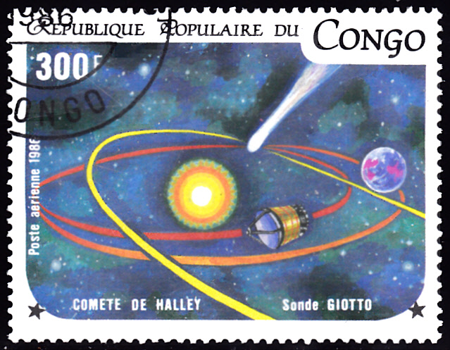 Aus dem Kongo-Brazzaville kommt diese Marke (MiNr 1027) mit der Raumsonde Giotto.