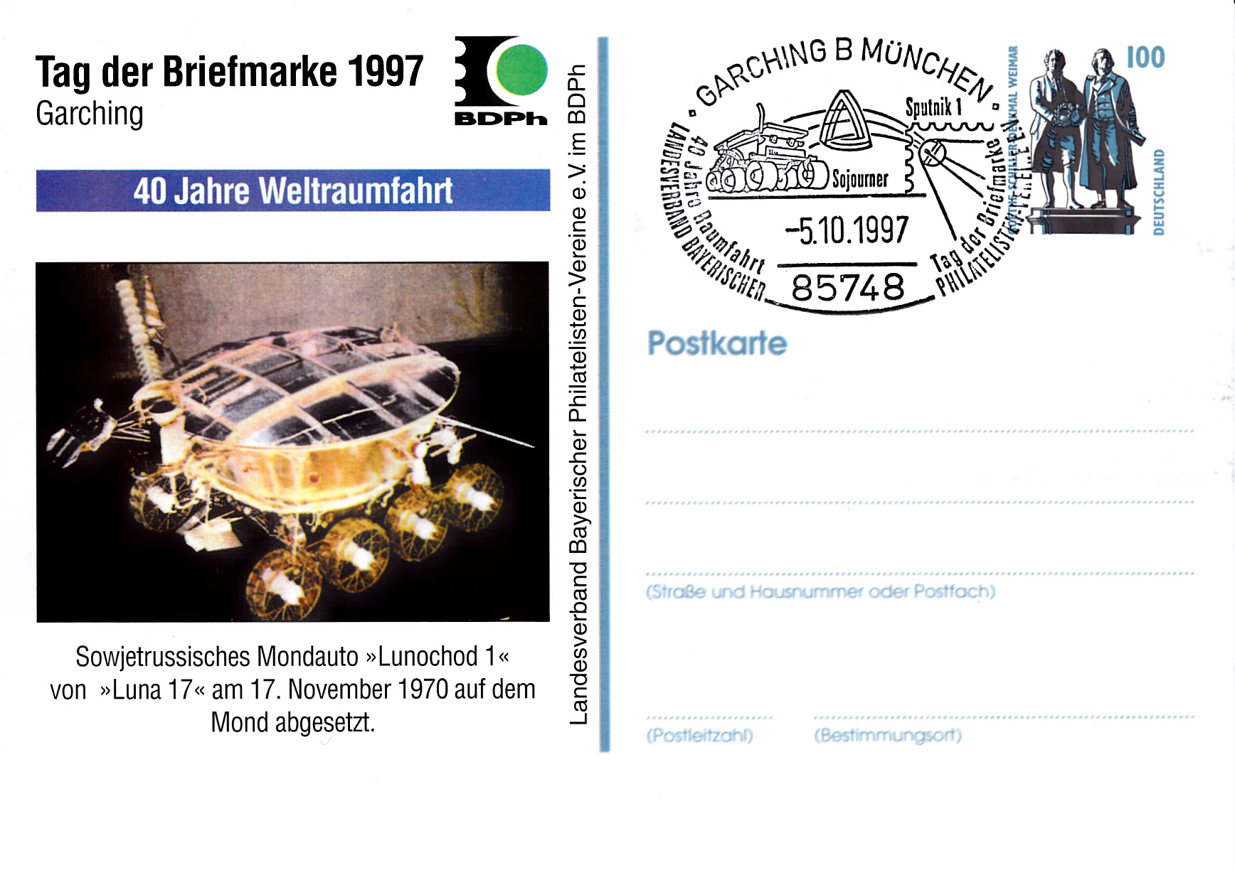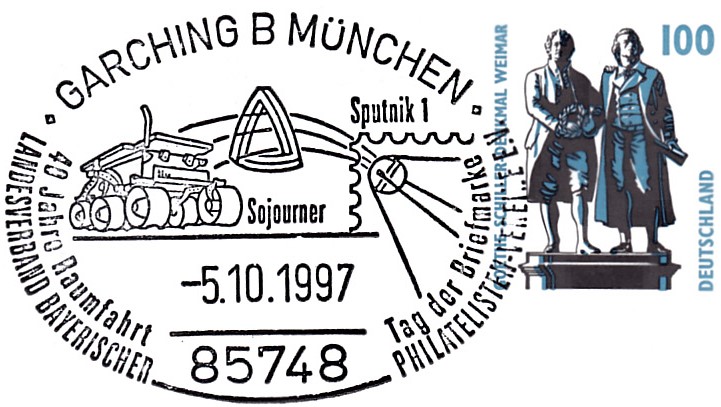 Der Landesverband Bayerischer Philatelisten-Vereine e.V. zeigt auf seiner Ganzsache zum Tag der Briefmarke 1997 das Mondauto "Lunochod 1" und in seinem Sonderstempel vom 5.10.1997 aus Garching bei München den Sputnik 1 und das Marsmobil "Sojurner" im Stempelbild.