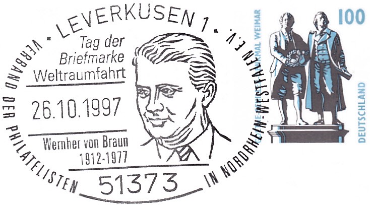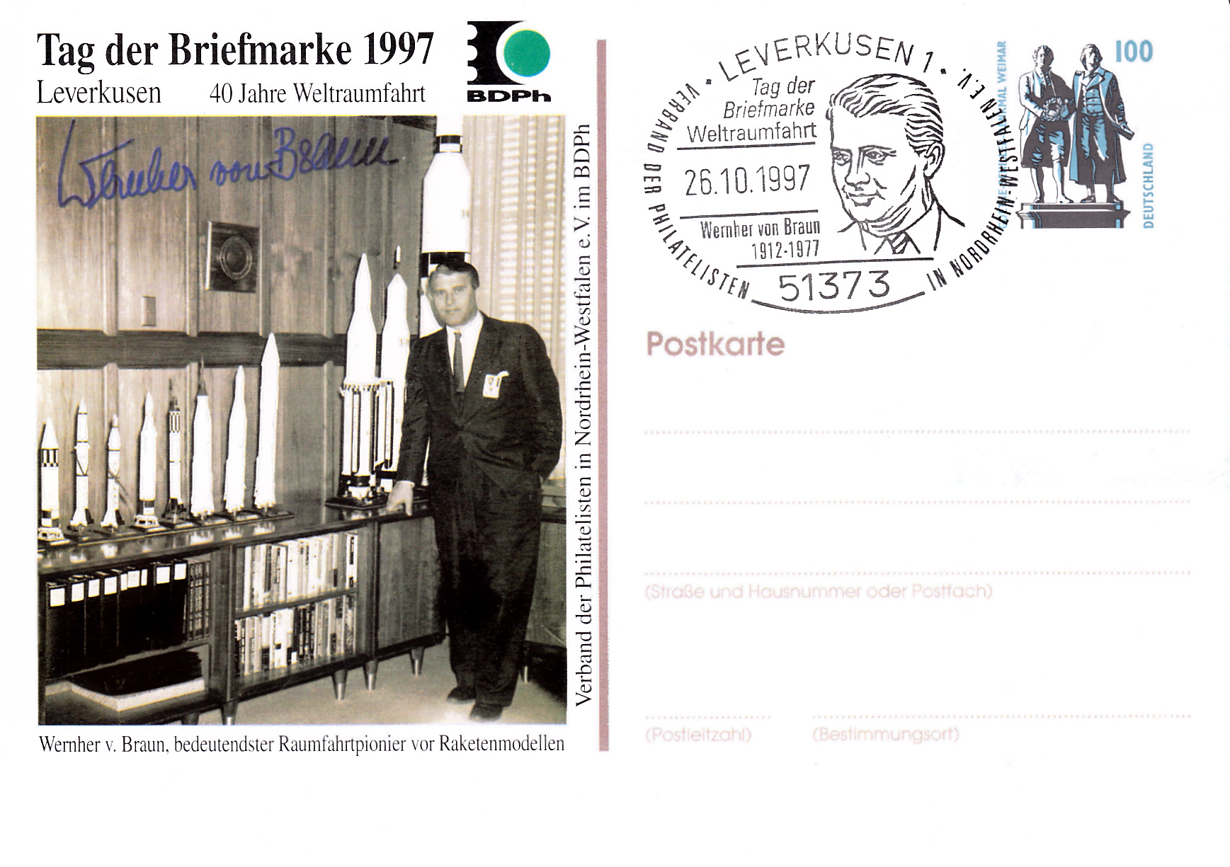 Der Verband der Philatelisten in Nordrhein-Westfalen e.V. zeigt auf seiner Ganzsachen-Postkarte zum Tag der Briefmarke 1997 und im Sonderstempel vom 26.10.1997 aus Leverkusen Wernher von Braun.