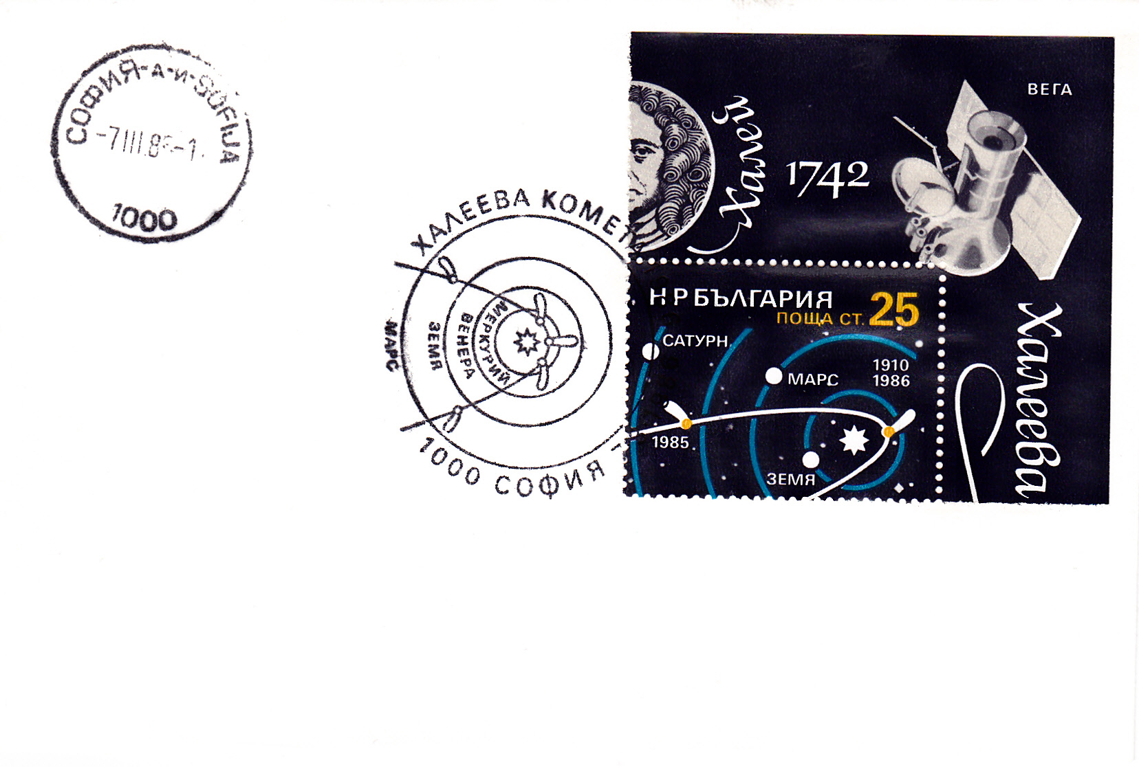 In Bulgarien erschien zum Thema "Halleyscher Komet" 1986 ein Block mit vier Marken. Die vier Markenbilder ergeben zusammen ein Gesamtbild mit der Flugbahn des Kometen in unserem Sonnensystem. Auf dem Blockrand öberhalb der rechten oberen Marke des Blockes ist die Vegasonde abgebildet.