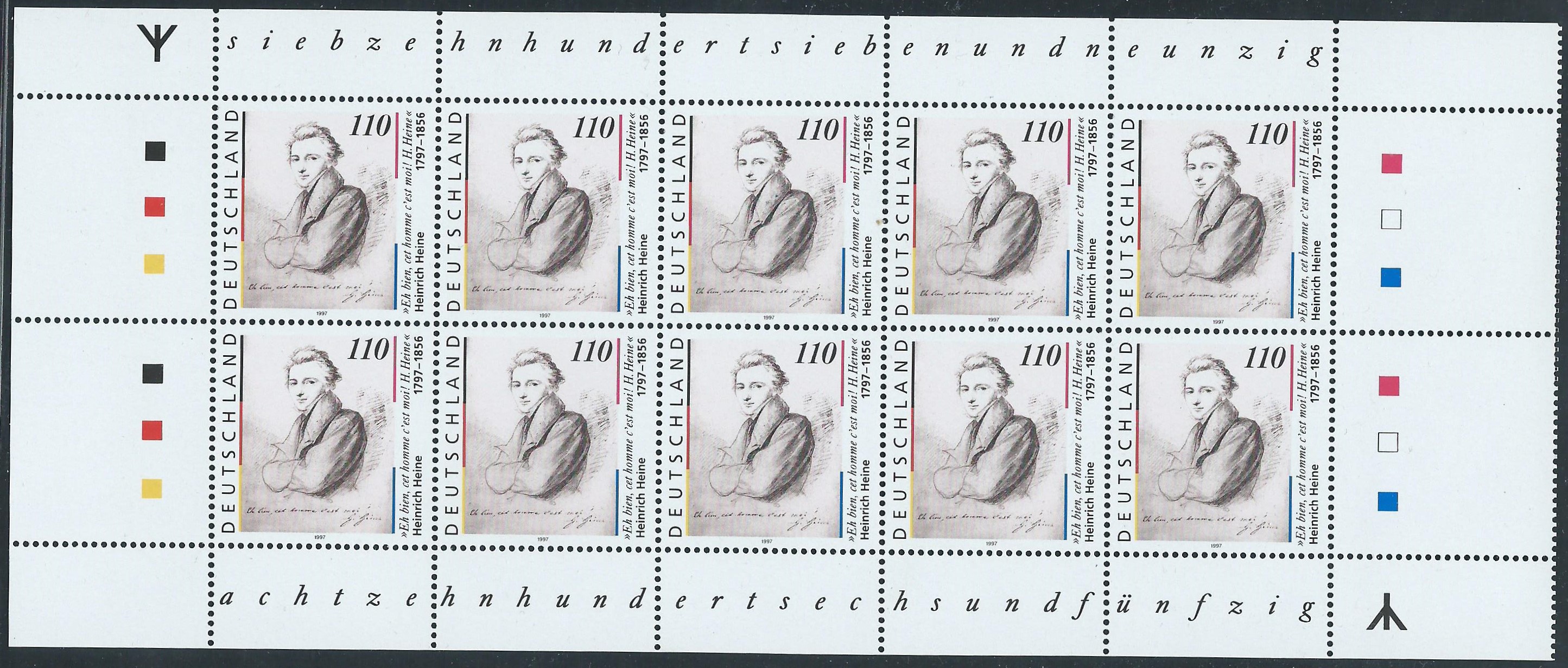 kürzlich konnte ich von der Mi.Nr. 1962, 200. Geburtstag Heinrich Heine, einen abartigen 10-er-Bogen eintauschen. Dieser hat links und rechts überbreite Ränder, rechts sogar mit Perforation in Markengrösse. Seht Euch das Bild an, im Vergleich dazu der original verausgabte 10-er-Bogen.