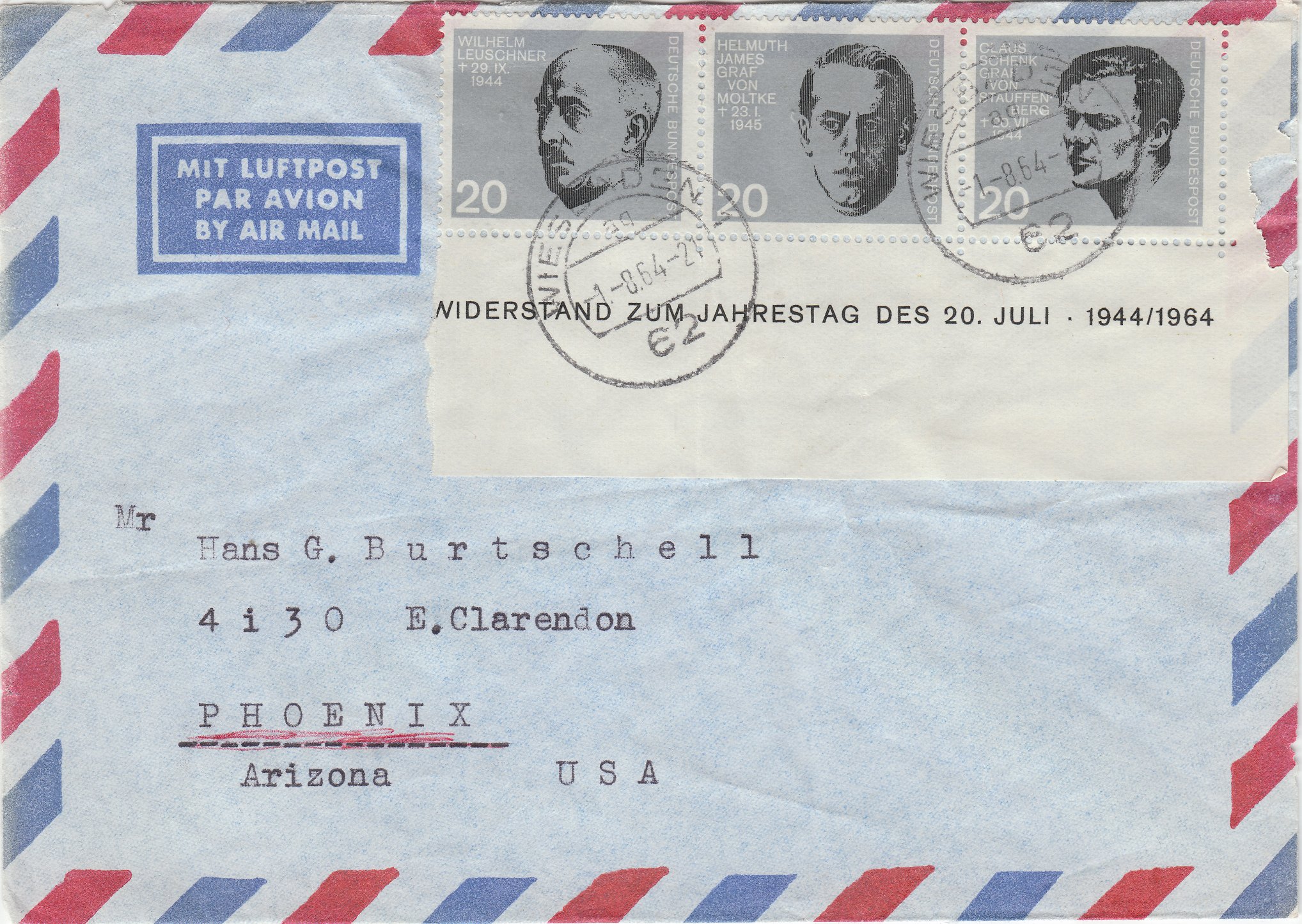 Hier wurde ein Zusammendruck der drei Marken MiNr. 436/8 am 01.08.1964 portorichtig auf einem Brief in die USA (40 Pf) per Luftpost (20 Pf) verwendet: