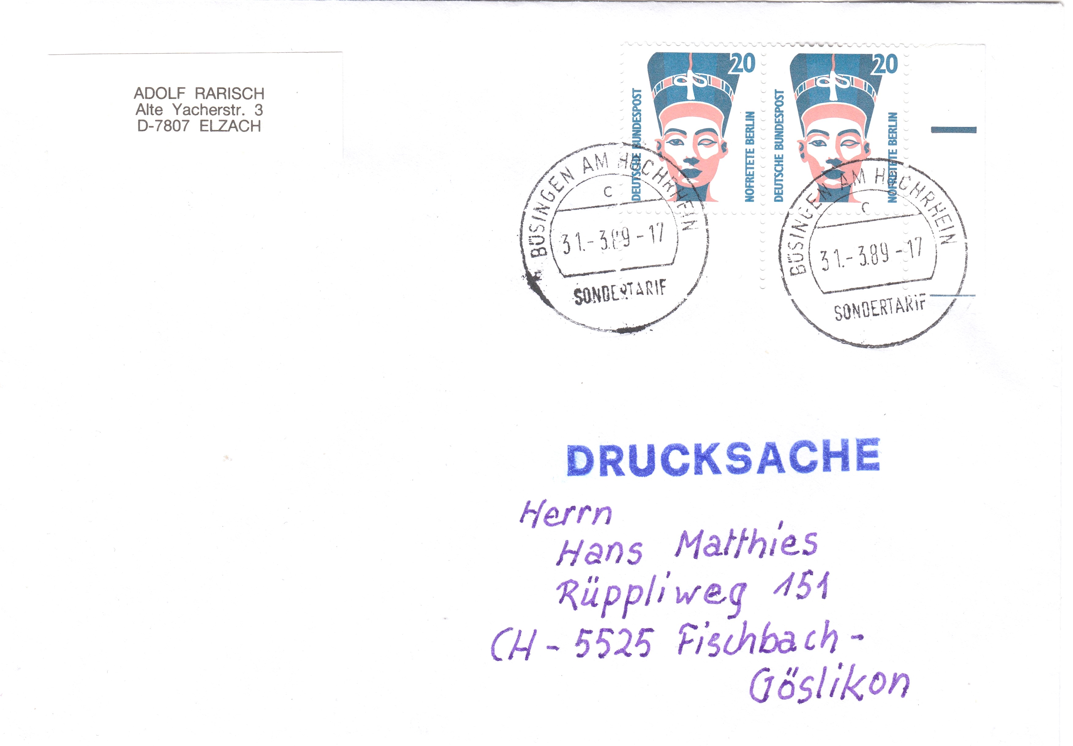 Paar des 20 Pf Wertes der Dauerserie SWK, Nr. 1398, Eckrand 4, am 31.03.1989 portorichtig als Drucksache zum Sondertarif ab der Exklave BÜSINGEN AM HOCHRHEIN, wo für Sendungen in die Schweiz die im Vergleich zu Deutschland geringeren Schweizer Portotarife galten, hier 35 Rappen = 40 Pf!